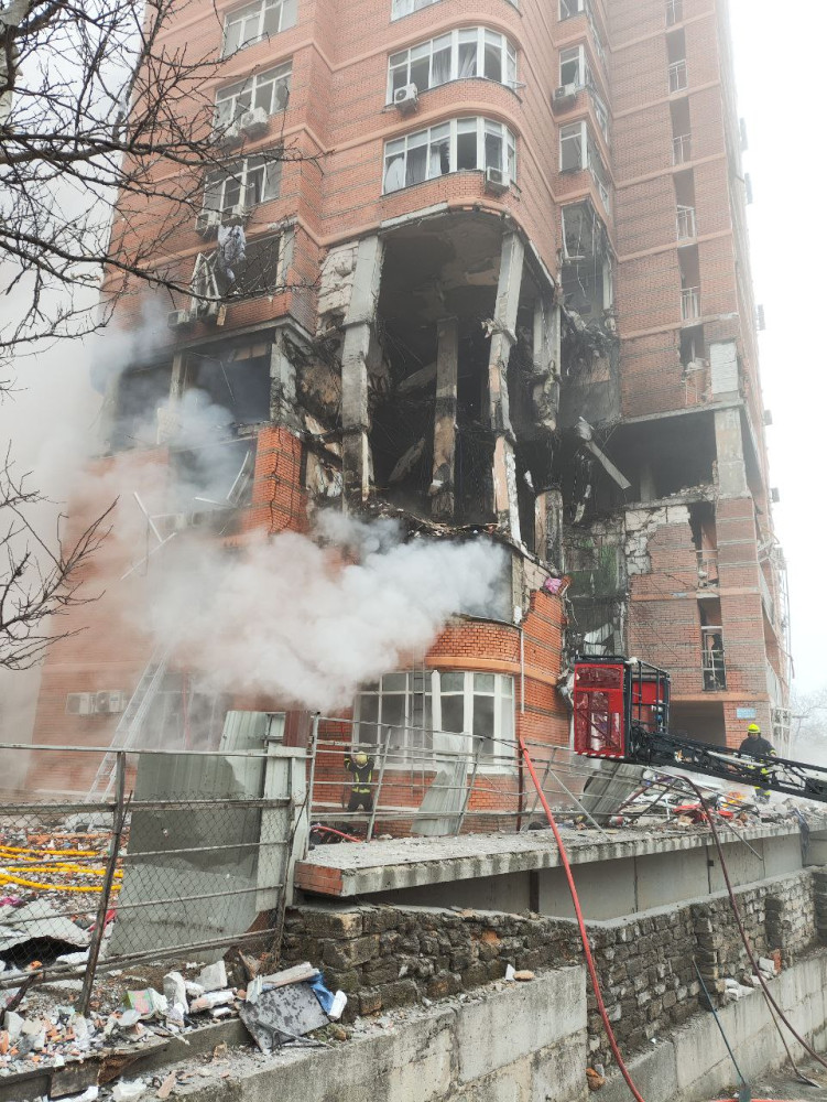 Евакуацію мешканців будинку, куди вранці прилетіла ворожа ракета, і розбір завалів проводять одеські рятувальники.
