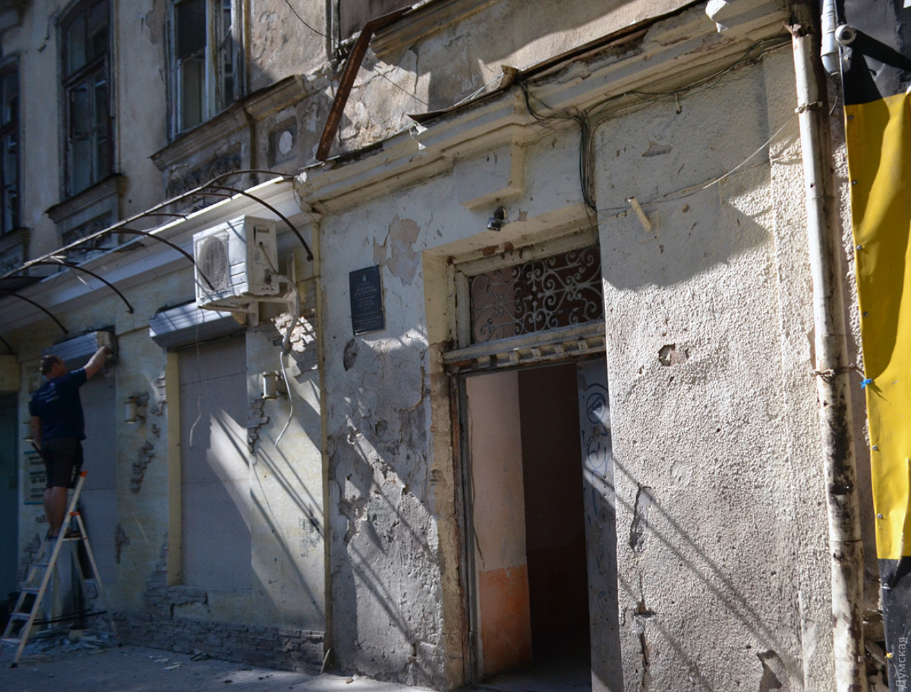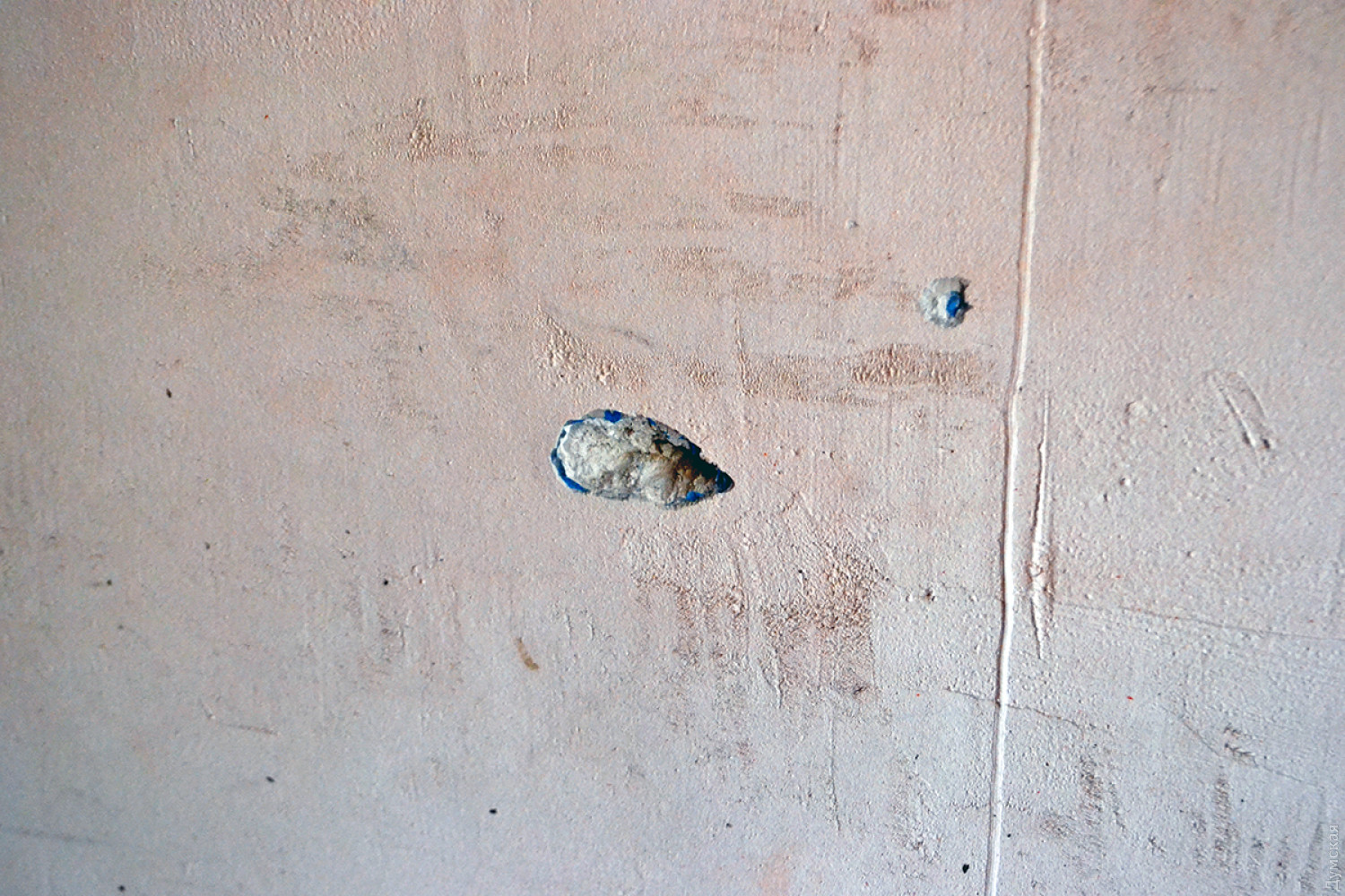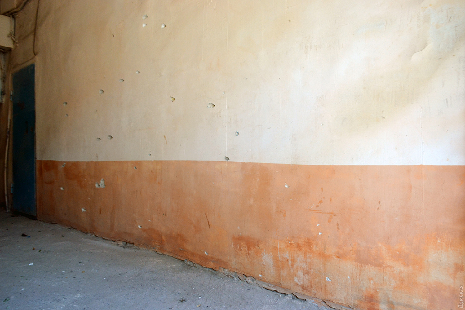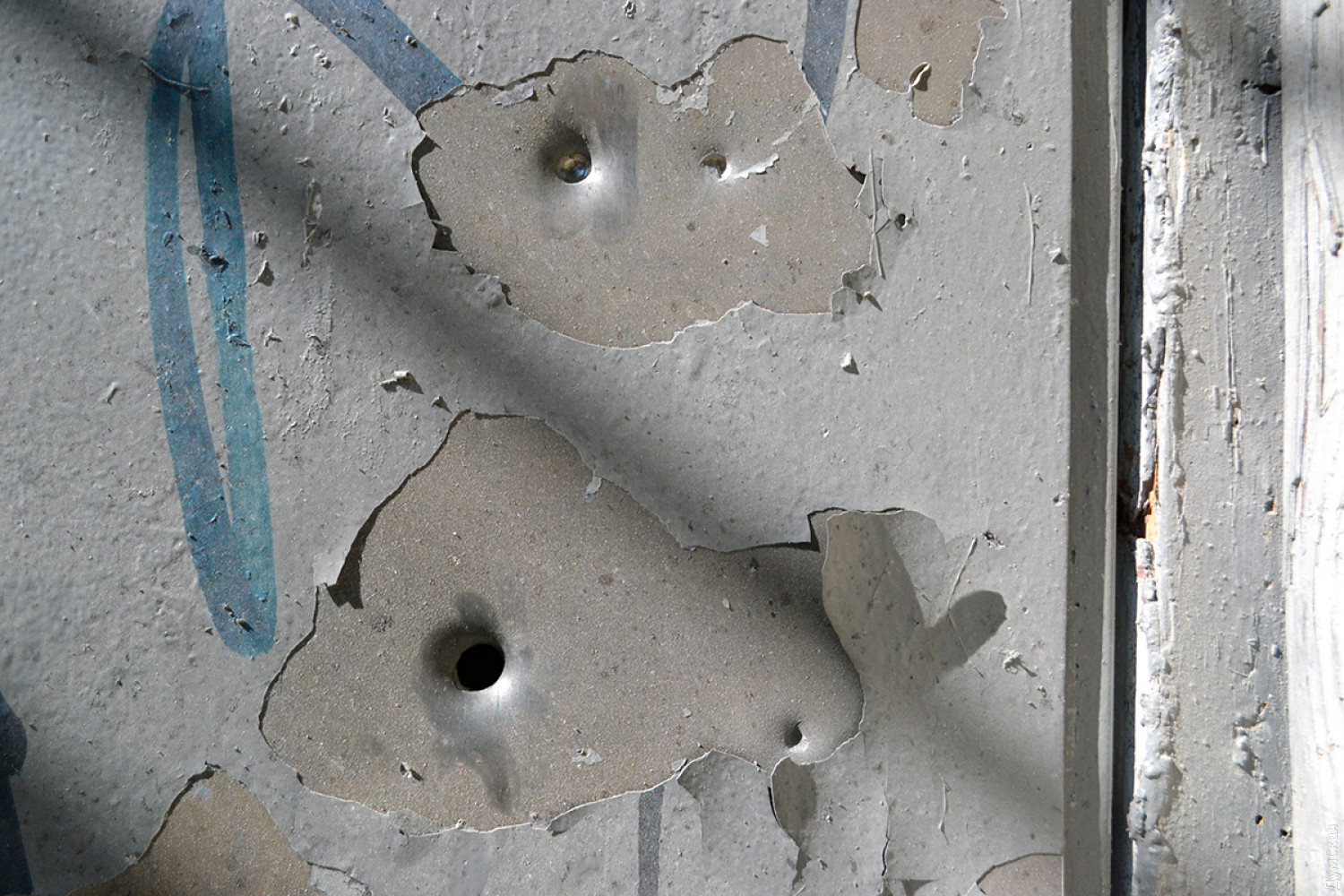 Видны также следы от стальных шариков в самой парадной — на стенах и потолке. На втором этаже дома выбиты окна.