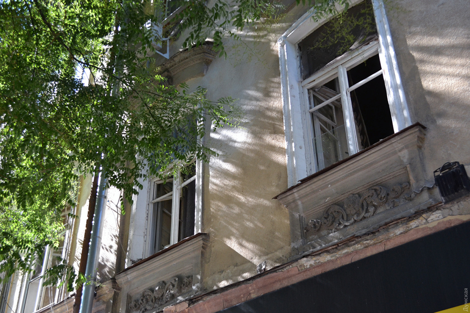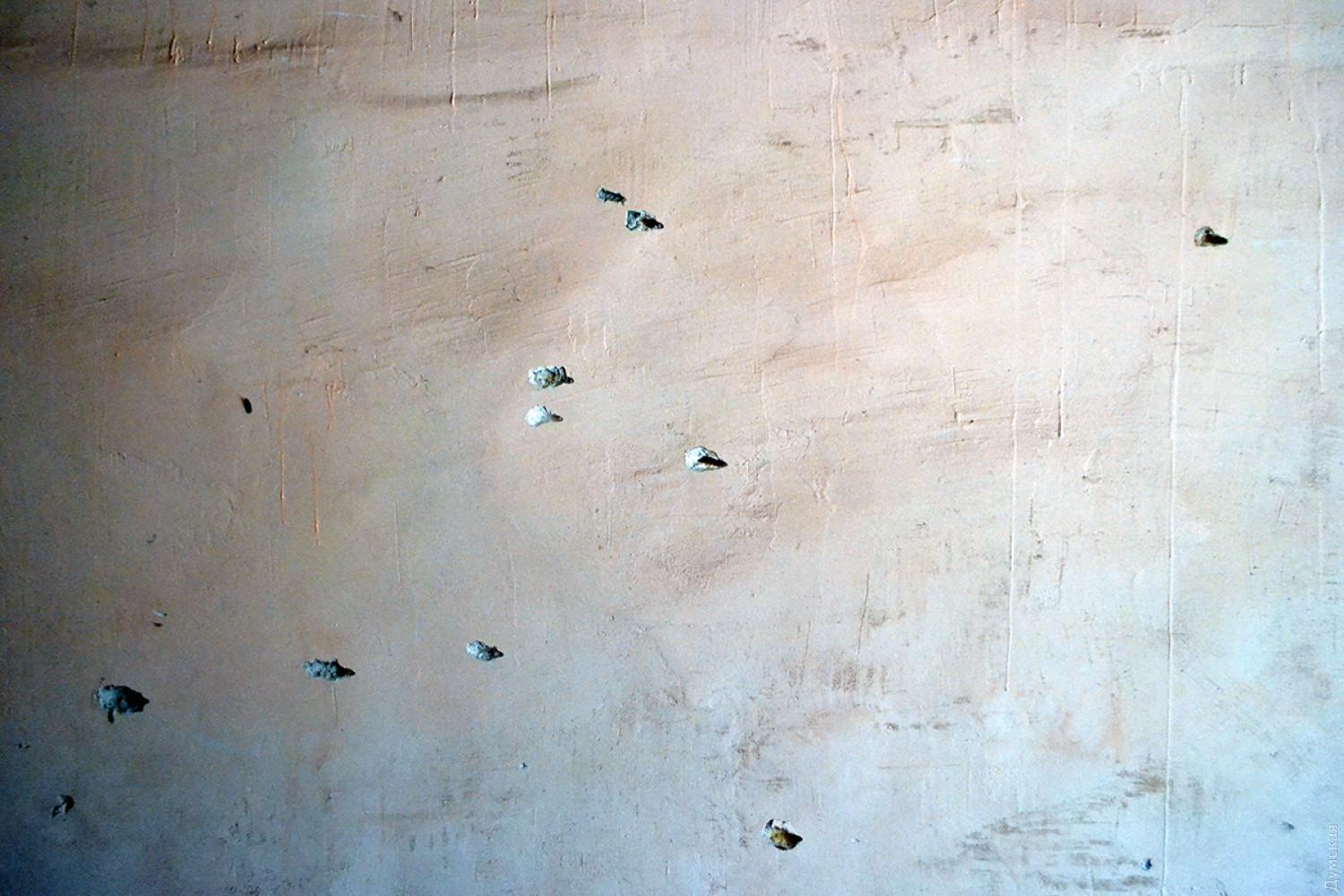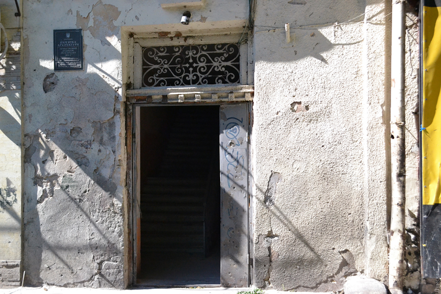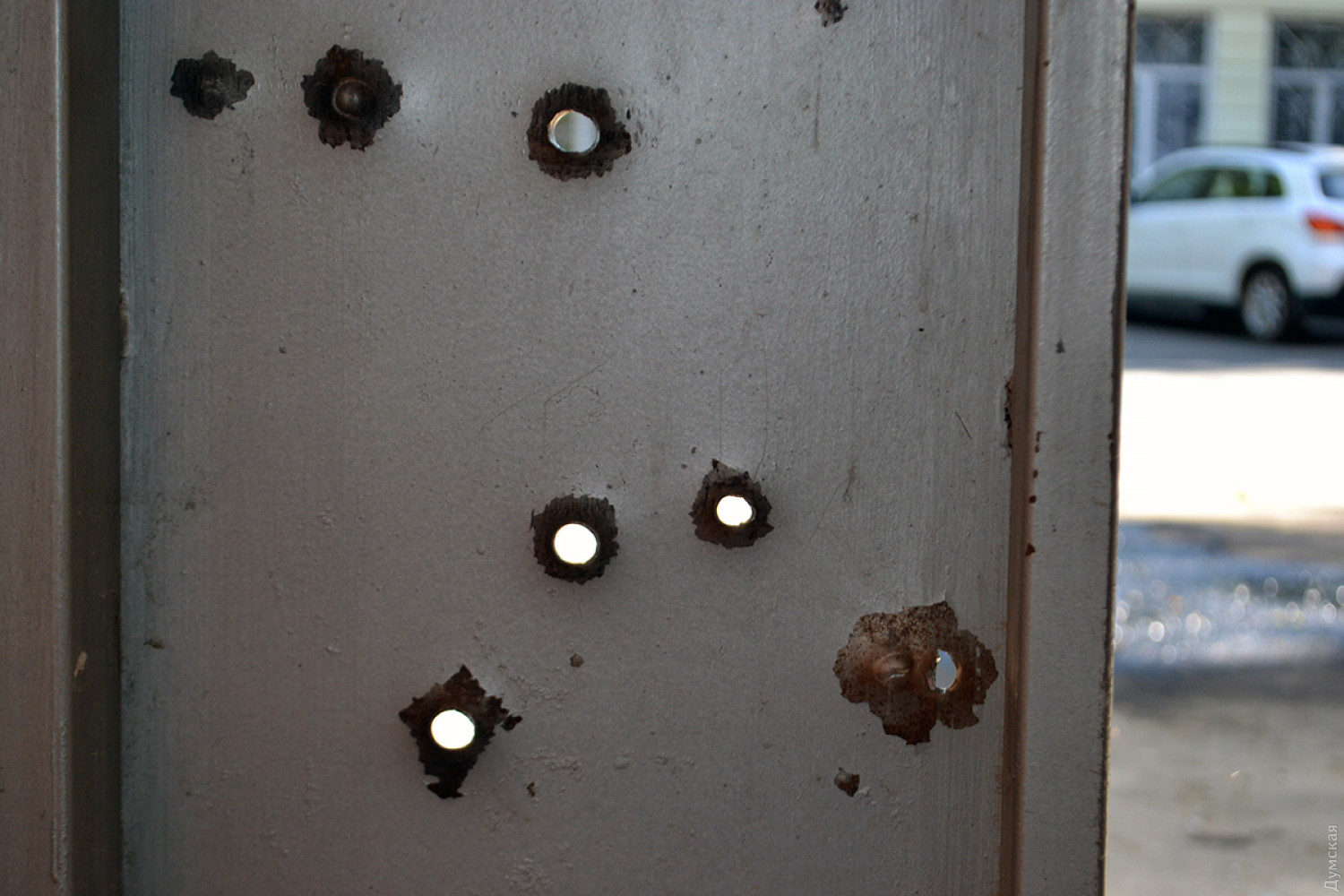 Видны также следы от стальных шариков в самой парадной — на стенах и потолке. На втором этаже дома выбиты окна.