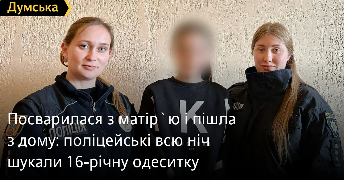 Посварилася з матір`ю і пішла з дому: поліцейські всю ніч шукали 16-річну одеситку16-річну одеситку, яка пішла з дому, розшукали правоохоронці. Про те, що донька зникла після сварки з нею, вночі повідомила мати, розповіли в поліції регіону. «На пошуки неповнолітньої одеситки одразу ж було орієнтовано весь особовий склад територіального підрозділу поліції. За ніч правоохоронці перевірили місця ймовірного перебування дівчини, опитали коло її друзів і знайомих, промоніторили її акаунти в соціальних мережах», — розповіли у пресслужбі. Вранці дівчину знайшли — вона ночувала у знайомих. На щастя, нічого поганого з нею не сталося. Ювенальні поліцейські повернули дівчину додому. На батьків склали адмінпротокол про невиконання обов'язків щодо виховання дітей (ч. 1 ст. 184 КУпАП). Помітили помилку? Виділяйте слова з помилкою та натискайте control-enter Новини по цій темі: 29 липня 2025: В Усатово Одеської області сталася перестрілка: поліція працює на місці (відео, оновлено) 28 липня 2025: П'яний на "Ягуарі" або гіпертонік? Звільнений топ-посадовець одеської поліції хоче повернутися на службу 19 червня 2025: Дівчинку, яку шукали сотні одеситів, знайшли вбитою: поліція працює з чоловіком, ймовірно причетним до загибелі 27 травня 2025: Увели гектар в університету: на Одещині засудили земельних аферистів, але без посадки і Хвоста |