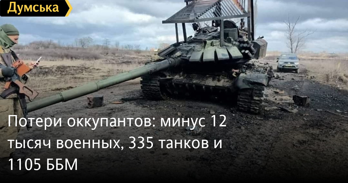 С начала военной агрессии РФ против Украины противник потерял более 12 тысяч личного состава, 335 танков и 1105 боевых бронированных машин. Об этом сообщили в Генштабе Вооруженных сил Украины. Также враг потерял: - 123 единицы артиллерийских систем; - 56 единиц РСЗО; - 29 единиц ПВО; - 49 самолетов; - 81 вертолет; - 526 единиц автомобильной техники; - два катера и один корабль; - 60 цистерн с ГСМ; - 7 БПЛА оперативно-тактического уровня. Данные постоянно обновляются и уточняются. Подсчет усложняется высокой интенсивностью боевых действий. СМЕРТЬ РОССИЙСКИМ ОККУПАНТАМ! Заметили ошибку? Выделяйте слова с ошибкой и нажимайте control-enter |