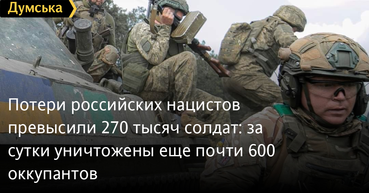 Втрати російських нацистів перевищили 270 тисяч солдатів: за добу знищено ще майже 600 окупантів590 російських загарбників 12 вересня припинили своє існування завдяки діям Сил оборони України. Загальні втрати ворога від початку повномасштабного вторгнення — 270 тисяч 350 окупантів. У Генеральному штабі Збройних сил України також повідомили про знищення 16 ворожих танків (4584 за весь час) та 14 бойових броньованих машин (8792). Також наші захисники спалили 30 артилерійських систем ворога (5902), дві реактивні системи залпового вогню (766), дві установки ППО (517). Крім того, в окупантів поменшало на 31 вантажівку й автозаправник (8444), три одиниці спецтехніки (884). ППО збила п'ять безпілотників оперативно-тактичного рівня (4650). СМЕРТЬ РОСІЙСЬКИМ ОКУПАНТАМ! Помітили помилку? Виділяйте слова з помилкою та натискайте control-enter |