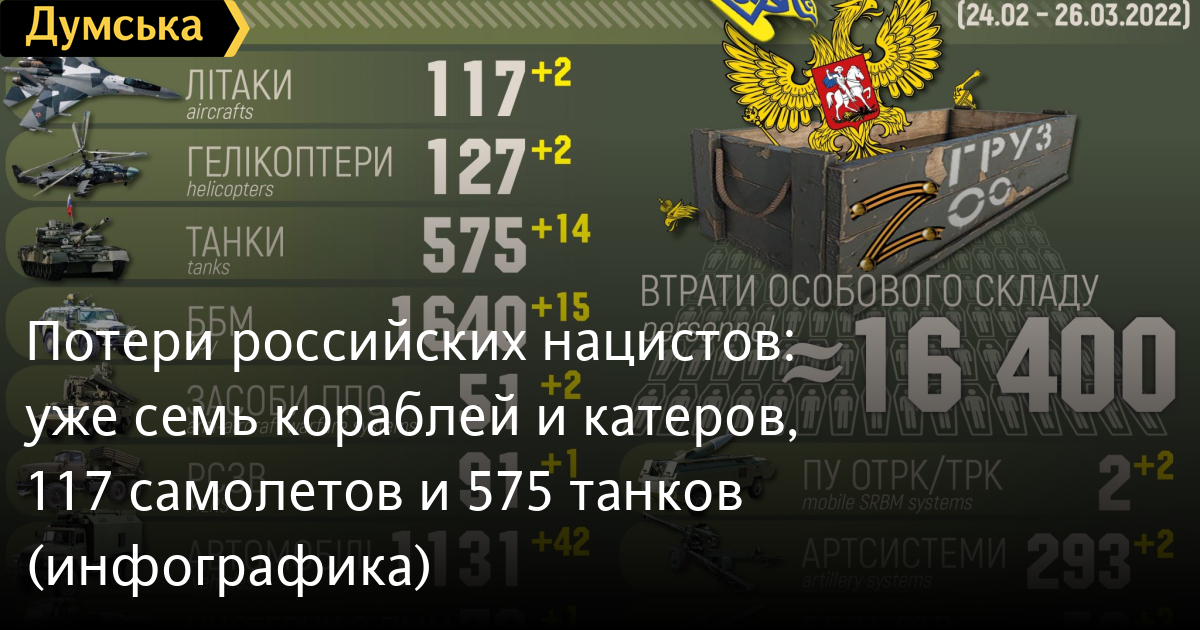 Как сообщает Генеральный штаб Вооруженных сил Украины, с начала полномасштабного вторжения, агрессор потерял свыше 16400 солдат и офицеров, 117 самолетов, 127 вертолетов, 575 танков, 1640 боевых бронированных машин, 51 средство ПВО, 91 РСЗО, 1131 автомобиль, 73 цистерны с горючим, 19 единиц спецтехники, две пусковые установки оперативно-тактических ракет, 293 артсистемы, 53 беспилотных летательных аппарата оперативно-тактического уровня, семь кораблей и катеров.