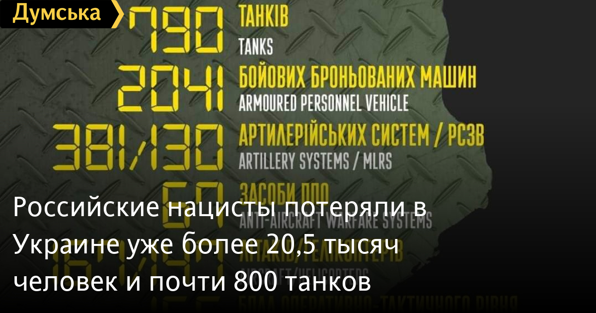 Также, агрессор потерял 167 самолетов, 147 вертолетов, 790 танков, 2041 боевых бронированных машин, 67 средств ПВО, 130 РСЗО, 1487 автомобилей, 76 цистерн с горючим, 27 единиц спецтехники, 4 пусковые установки оперативно-тактических ракет, 381 артсистемы, 155 беспилотных летательных аппарата оперативно-тактического уровня, 8 кораблей и катеров.