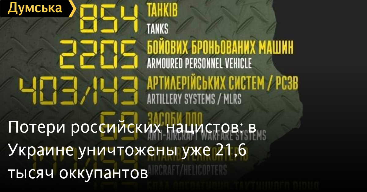 По данным Генерального штаба Вооруженных сил Украины, количество уничтоженных оккупантов на данный момент составляет 21,6 тысяч.