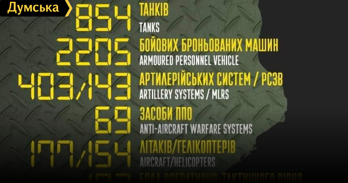 Силы обороны Украины продолжают ликвидировать российских нацистов и их технику на территории нашей страны. По данным Генерального штаба Вооруженных сил Украины, количество уничтоженных оккупантов на данный момент составляет 21,6 тысяч. Также, агрессор потерял 177 самолетов, 154 вертолета, 854 танка, 2205 боевых бронированных машин, 69 систем ПВО, 143 реактивные системы залпового огня, 1543 автомобиля, 76 цистерн с горючим, 27 единиц спецтехники, 4 пусковые установки оперативно-тактических ракет, 403 артсистемы, 182 беспилотных летательных аппарата оперативно-тактического уровня, 8 кораблей и катеров. Данные уточняются. СМЕРТЬ РОСІЙСЬКИМ ОКУПАНТАМ! Помітили помилку? Виділяйте слова з помилкою та натискайте control-enter |