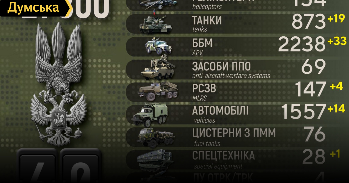 Потери российских нацистов: за два месяца украинские защитники уничтожили 21,8 тысяч оккупантов и более полусотни единиц техники противника только за прошедшие суткиОриентировочно 21,8 тысяч вторгшихся в Украину оккупантов уничтожены за два месяца украинскими защитниками с 24 февраля. Как сообщают в Генштабе Вооруженных сил Украины, данные еще уточняются из-за активных боевых действий. Только за вчера противник лишился 19 танков, 33 боевых бронированных машин, двух самолетов, четырех реактивных систем залпового огня, 14 автомобилей, единицы спецтехники, пяти артсистем и девяти беспилотных летательных аппаратов оперативно-тактического уровня. Всего за время полномасштабного военного вторжения потери врага в технике следующие: 179 самолетов, 154 вертолета, 873 танка, 2238 ББМ, 69 систем ПВО, 147 РСЗО, 1557 автомобилей, 76 цистерн с горючим, 28 единиц спецтехники, 4 пусковые установки оперативно-тактических ракет, 408 артсистем, 191 БПЛА, 8 кораблей и катеров. Инфографика: АрміяІнформ СМЕРТЬ РОСІЙСЬКИМ ОКУПАНТАМ! Помітили помилку? Виділяйте слова з помилкою та натискайте control-enter |