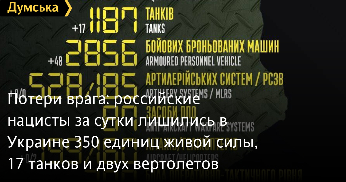 350 солдат, 17 танков, 48 бронемашин и два вертолета потеряли российские нацисты за минувшие сутки в Украине.