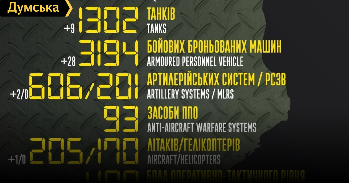 Потери врага: за сутки российские нацисты лишились в Украине 150 солдат, девяти танков, самолета и почти трех десятков боевых бронемашин150 солдат, девять танков и самолет потеряли российские нацисты за минувшие сутки в Украине. По данным Генштаба Вооруженных сил Украины, всего с 24 февраля российские нацисты лишились в нашей стране 29 тысяч 350 единиц живой силы и 1302 танков. Также за прошедшие сутки украинские защитники уничтожили 28 боевых бронированных машин противника, две артиллерийские системы, четыре БПЛА оперативно-тактического уровня, две крылатые ракеты и семь единиц автомобильной техники. Наибольшие потери противника наблюдались на северодонецком направлении. СМЕРТЬ РОСІЙСЬКИМ ОКУПАНТАМ! Помітили помилку? Виділяйте слова з помилкою та натискайте control-enter |