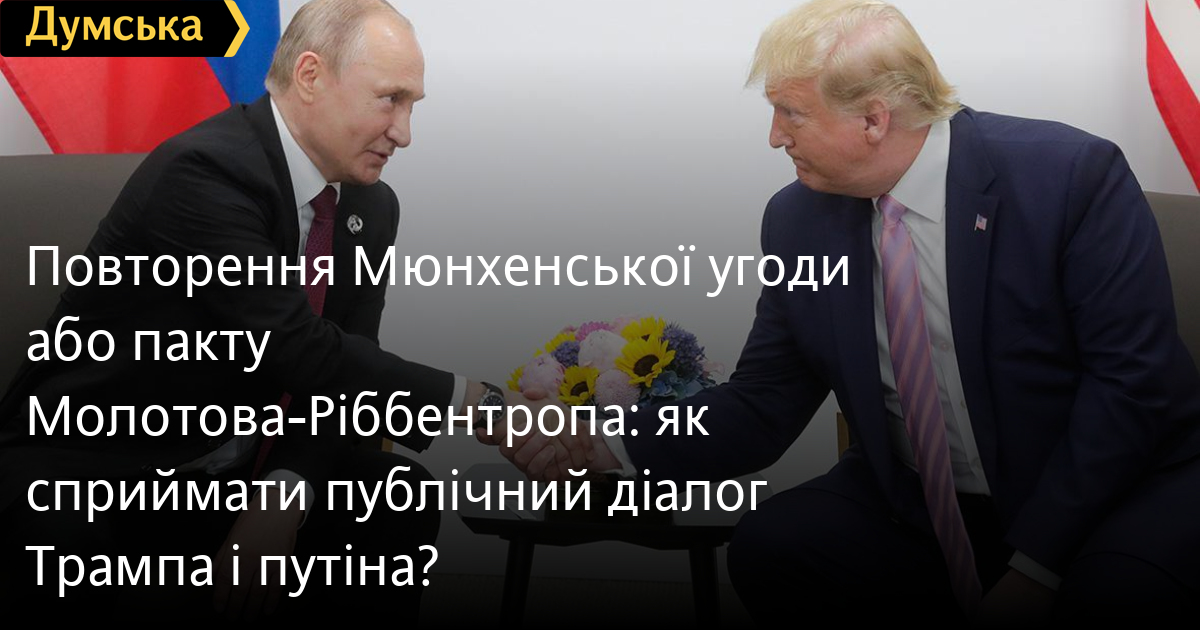Повторення «Мюнхенської угоди» або пакту Молотова-Ріббентропа: як сприймати публічний діалог Трампа і путіна?Ввечері 12 лютого переговорний процес між США та росією щодо «врегулювання» війни в Україні, який, судячи з численних заяв світових ЗМІ та ухильних цитат представників обох сторін, розпочався ще кілька тижнів чи навіть місяців тому, нарешті набув офіційних рис на найвищому рівні. Дональд Трамп та адміністрація кремля синхронно випустили заяви про те, що відбулася «тривала та ґрунтовна» розмова між главами двох держав, яка тривала майже півтори години. За кілька хвилин після бесіди з кремлівським диктатором Трамп зателефонував президенту України Володимиру Зеленському і проговорив із ним ще близько години. Отже, після численних підкилимних реверансів крига «договорняка», про який ми нещодавно писали, все-таки скресла! За кілька годин Трамп заявив, що планує провести зустріч із путіним у Саудівській Аравії, а потім додав, що згодом хотів би запросити його до США, а потім і самому поїхати в росію. Такі новини приголомшили українське суспільство і спровокували весь спектр емоцій — від тотальної «зради» і «ганьби», до обережного оптимізму. Деякі коментатори і зовсім намагаються не вірити в те, що відбувається, і дотримуються позиції, що і Трампу, і путіну властиво говорити одне, а робити зовсім інше. Спробуємо і ми проаналізувати цей дійсно важливий дипломатичний хід. Спойлер: скоріше за все, нічого хорошого нам чекати не доводиться. ЗАГАЛЬНА ОЦІНКА ПІДСУМКІВ РОЗМОВИ ТРАМПА І ПУТІНА Почнемо з того, що чималу роль відіграє сам факт телефонного дзвінка, що відбувся, який повною мірою повертає главу країни-агресора в коло «рукопожатних» світових лідерів. І тепер усім іншим главам західних держав потрібно якось це переварити і, найімовірніше, також змінити свій підхід до спілкування з путіним. Рівнозначно це стосується й України. Отже, Трамп задав новий тренд: real politic, just business, як то кажуть, і нічого більше. По-друге, звернемо увагу на вельми компліментарний тон обох сторін при підсумковій оцінці розмови. По-перше, це вочевидь може свідчити про те, що обидва президенти були справді задоволені цим діалогом і знайшли якісь точки дотику. Також можна припустити, що спілкування було не конфліктним і вже точно ніхто спересердя не кинув слухавку. Адже в разі зриву переговорів про них могли б просто не повідомити або ж інформація про невдалий контакт могла б виплисти набагато пізніше, як, наприклад, кілька днів тому стало відомо про попередню розмову Трампа і путіна, що відбулася якийсь час тому. По-третє, судячи із заяв, які поспіхом з'явилися в європейських ЗМІ, публічний діалог Трампа і путіна став «несподіваним» для європейських лідерів, які оцінюють його ніяк інакше, як «продаж України». Можемо трактувати його навіть ширше — це продаж Європи. Тобто, незважаючи на повідомлення, які з'явилися раніше, про те, що представники дипломатичної команди Трампа нібито взяли паузу для консультацій з європейцями, цього з якихось причин не сталося і він віддав перевагу прямому діалогу з агресором «через голову» своїх союзників по НАТО. Це безумовно можна оцінювати як дуже поспішний і небезпечний крок, який створює величезний виклик для всієї європейської безпеки. Однак до цього пункту ми більш детально повернемося дещо пізніше. Не менш трив