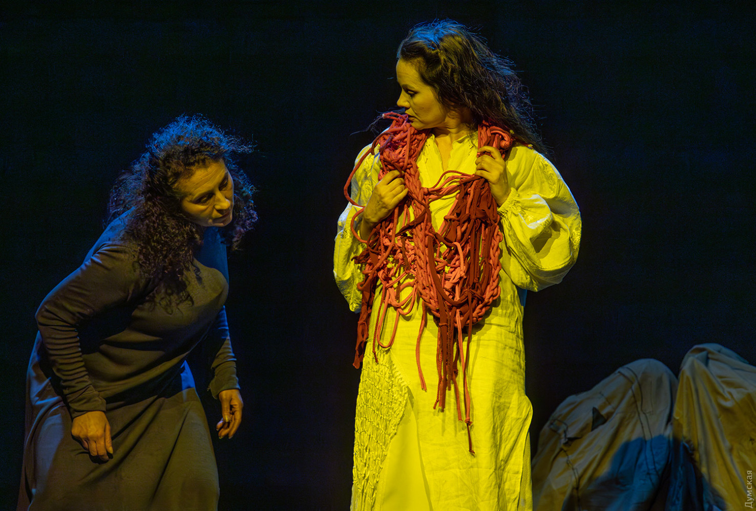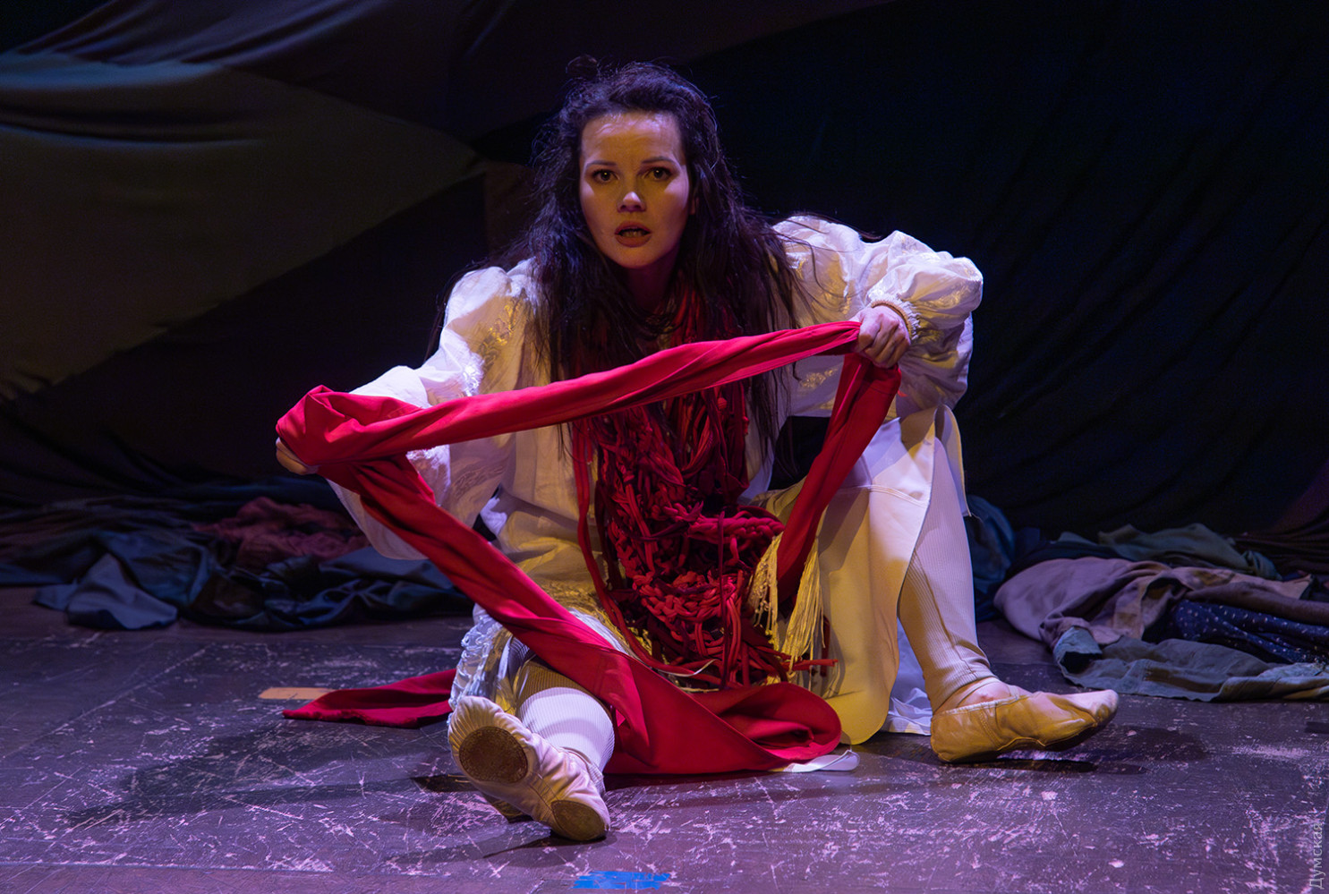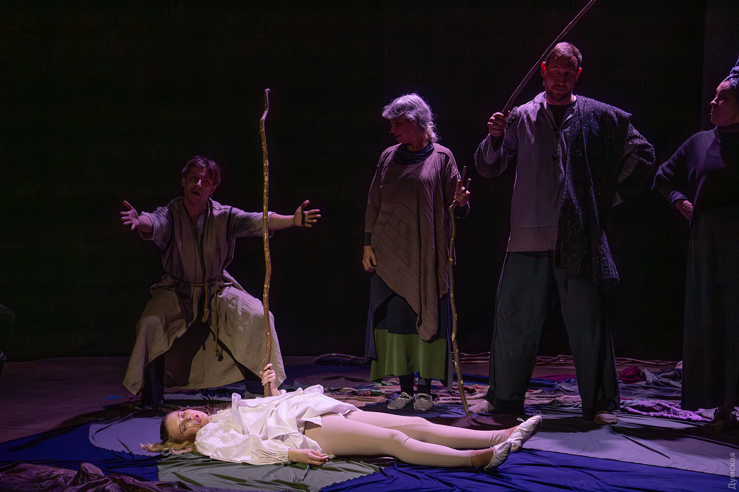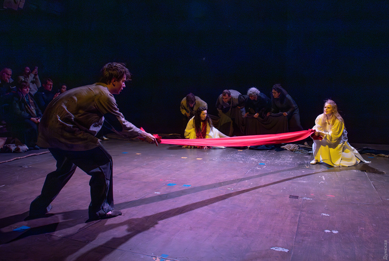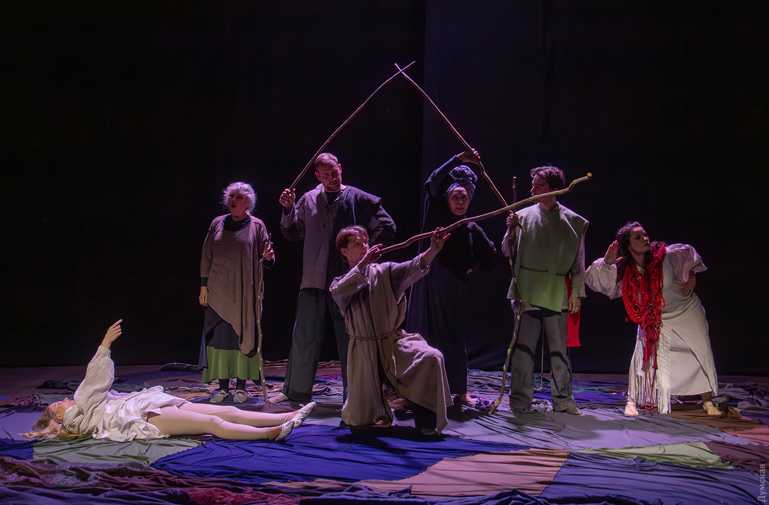 Премьера спектакля «Калинова сопілка» по мотивам повести Оксаны Забужко состоялась в Одесском академическом театре юного зрителя. Блекаут внес коррективы — начало задержали, перенастраивая сценическое освещение под работу генератора. Это первая в нашем городе театральная постановка по произведению «Казка про калинову сопілку» современной украинской писательницы и поэтессы. Повесть написана достаточно давно, но именно сейчас на украинских сценах появляется версия за версией (даже кукольный спектакль есть). Может, потому, что время задуматься о природе зла, в том числе, спрятанного в своей душе. Молодой режиссер Полина Коробейник сделала собственную сценическую версию произведения, ведь знаменитые забужковские предложения слишком длинные для провозглашения, их лучше читать глазами. Зато такие предложения можно легко разбить на реплики персонажей. Играют спектакль в формате «зритель на сцене»: так эта мистическая история приобретает особенно зловещее звучание. Поскольку перед нами разворачивается история о сестроубийстве, Каин и Авель уступают место Ганне и Оленке, мы должны заметить, что писательницу вдохновила библейская история. Ее нам сперва и покажут, это скелет сюжета, разыграют коротенько, как пошли по ягоды дедова дочка, да бабина дочка. Бабина вонзила дедовой в сердце нож и вернулась домой, мол, сестра за ней идет. А вскорости в село приходят чумаки, рассказывают, как под лесом с куста калины срезали ветку, выстрогали сопилку, а та человеческим голосом говорит, убийцу девушки обличает… Далее сказка возвращается к своему началу и наполняется деталями и смыслами, которые добавила Оксана Забужко. Так мы узнаем, что «бабина дочка» Ганнуся – любимица своей матери, а «дедова дочка» Оленка – папино любимое дитя. Смешивая приемы драмы и перформанса, актеры играют и персонажей, и голос от автора. То заворачиваясь в огромную драпировку из лоскутов ткани, то ползая по ней, будто по лугу, то даже купаясь в ней, словно в речке, постукивая посохами (они же ножи и сопилки), исполнители проверяют нашу способность принимать меру условности. Художница Елена Штепура, хореограф Мария Мартос, художница по костюмам Людмила Войновская вместе с режиссером сделали целостное произведение, не понять, где заканчиваются полномочия одного из авторов спектакля и начинаются полномочия другого. Надо сказать, что игра Златы Скальской, которая органично смотрится в ролях Золушки и других хороших сказочных девочек, впечатляет совсем по-иному. Ее Ганна-панна одновременно и невероятно одарена от природы, и глубоко несчастна, так как не оправдываются надежды на лучшую жизнь, что-то темное и жестокое растет в душе. Мать надевает на нее красный платок-ожерелье из прочных нитей, это и знак того, что Ганнуся уже не ребенок, а девушка, и намек на кровь, которая неизбежно прольется. Кто же виноват в том, что красавица Ганна сжила со свету младшую сестричку? Возможно, всему причиной первородный грех, который искупает человечество. Виновата ли мать Мария (заслуженная артистка Украины Оксана Бурлай-Питерова), пророчившая дочку незаурядную судьбу, задуривала голову сказочкой «про Ганну-панну, яка тричі приїздила на королівський бенкет — спершу четвериком, тоді шестериком, а тоді восьмериком таких вороних, як змїї, що являлися їй із розкритої верби». Что-т