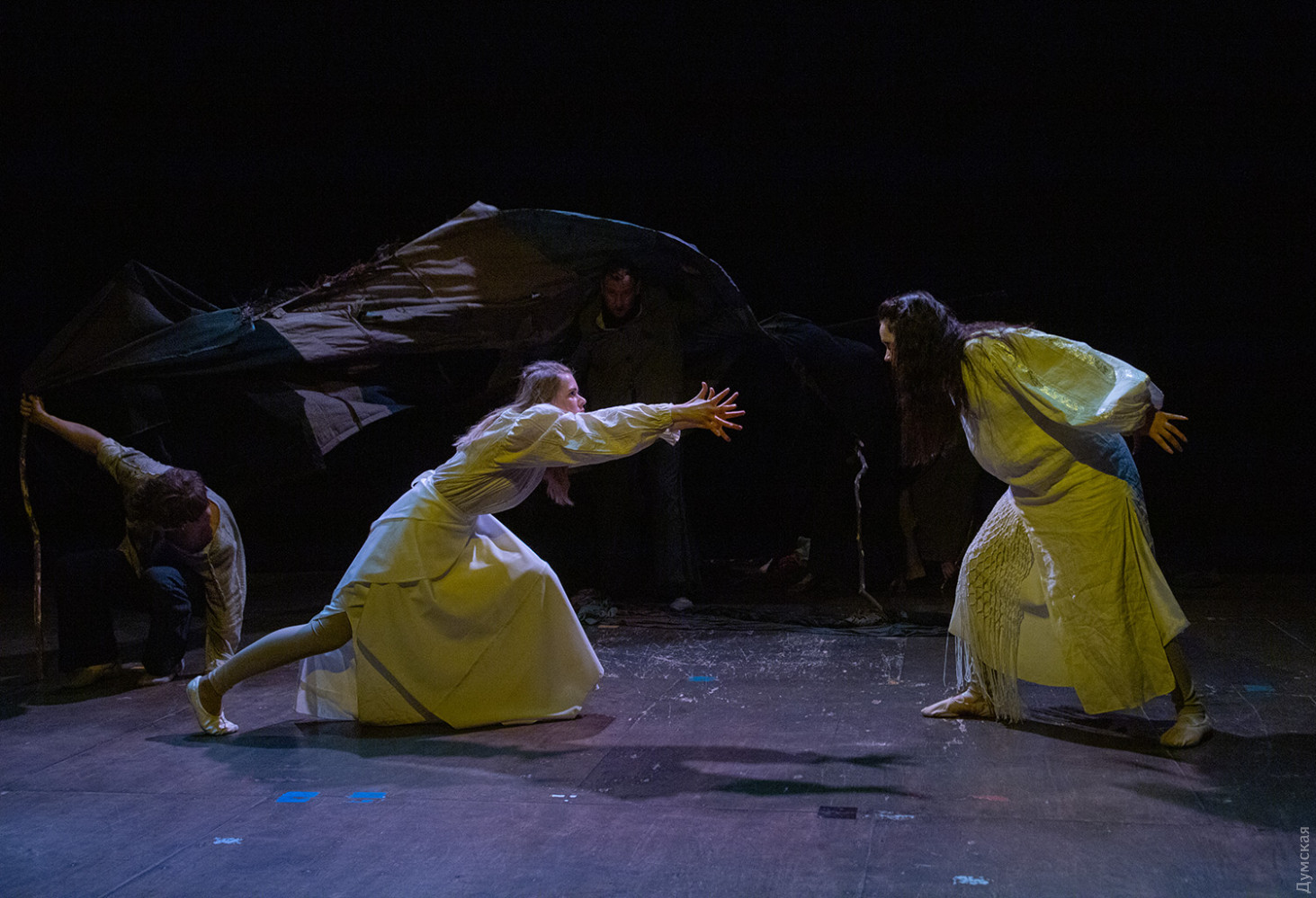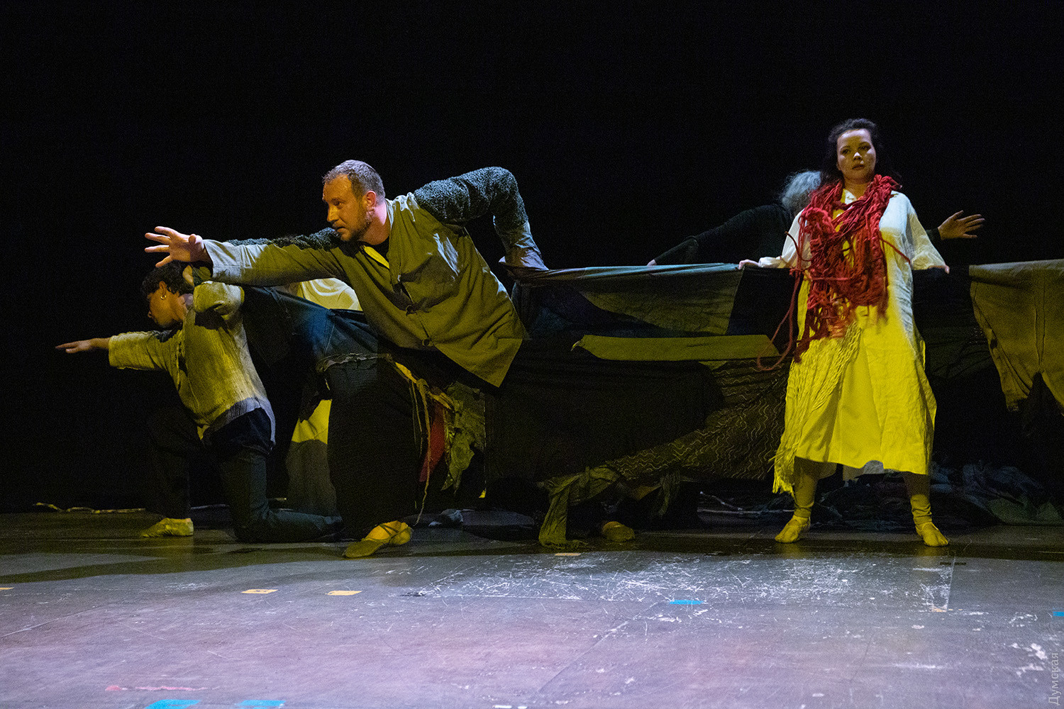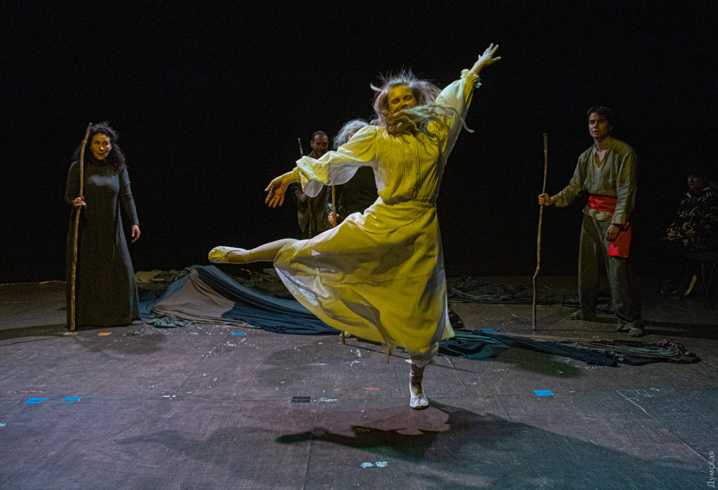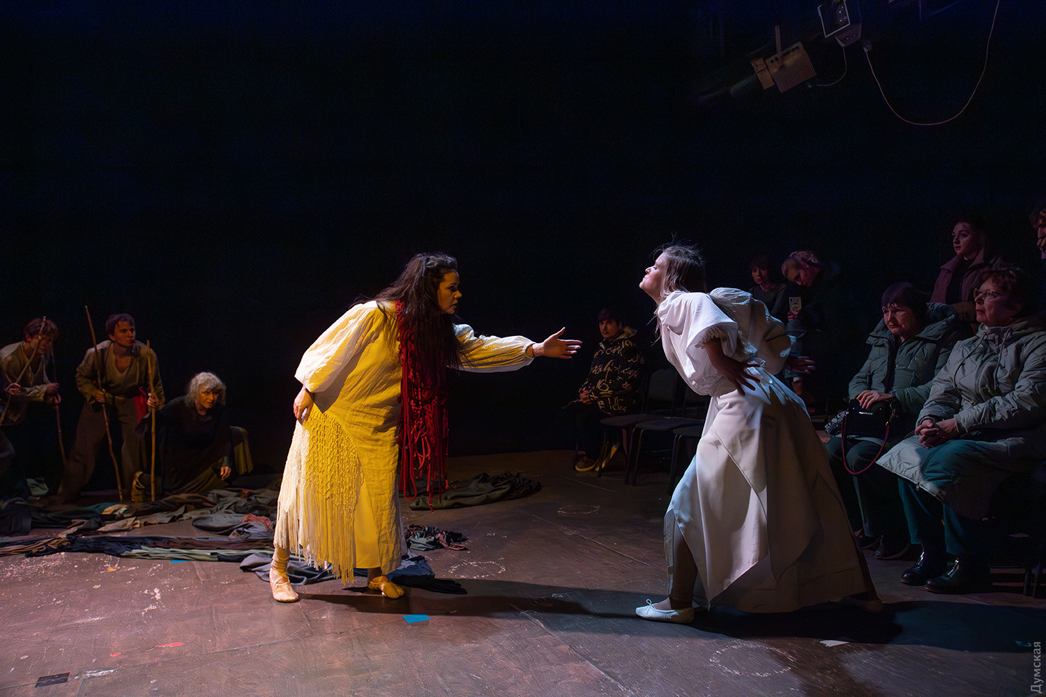 Премьера спектакля «Калинова сопілка» по мотивам повести Оксаны Забужко состоялась в Одесском академическом театре юного зрителя. Блекаут внес коррективы — начало задержали, перенастраивая сценическое освещение под работу генератора. Это первая в нашем городе театральная постановка по произведению «Казка про калинову сопілку» современной украинской писательницы и поэтессы. Повесть написана достаточно давно, но именно сейчас на украинских сценах появляется версия за версией (даже кукольный спектакль есть). Может, потому, что время задуматься о природе зла, в том числе, спрятанного в своей душе. Молодой режиссер Полина Коробейник сделала собственную сценическую версию произведения, ведь знаменитые забужковские предложения слишком длинные для провозглашения, их лучше читать глазами. Зато такие предложения можно легко разбить на реплики персонажей. Играют спектакль в формате «зритель на сцене»: так эта мистическая история приобретает особенно зловещее звучание. Поскольку перед нами разворачивается история о сестроубийстве, Каин и Авель уступают место Ганне и Оленке, мы должны заметить, что писательницу вдохновила библейская история. Ее нам сперва и покажут, это скелет сюжета, разыграют коротенько, как пошли по ягоды дедова дочка, да бабина дочка. Бабина вонзила дедовой в сердце нож и вернулась домой, мол, сестра за ней идет. А вскорости в село приходят чумаки, рассказывают, как под лесом с куста калины срезали ветку, выстрогали сопилку, а та человеческим голосом говорит, убийцу девушки обличает… Далее сказка возвращается к своему началу и наполняется деталями и смыслами, которые добавила Оксана Забужко. Так мы узнаем, что «бабина дочка» Ганнуся – любимица своей матери, а «дедова дочка» Оленка – папино любимое дитя. Смешивая приемы драмы и перформанса, актеры играют и персонажей, и голос от автора. То заворачиваясь в огромную драпировку из лоскутов ткани, то ползая по ней, будто по лугу, то даже купаясь в ней, словно в речке, постукивая посохами (они же ножи и сопилки), исполнители проверяют нашу способность принимать меру условности. Художница Елена Штепура, хореограф Мария Мартос, художница по костюмам Людмила Войновская вместе с режиссером сделали целостное произведение, не понять, где заканчиваются полномочия одного из авторов спектакля и начинаются полномочия другого. Надо сказать, что игра Златы Скальской, которая органично смотрится в ролях Золушки и других хороших сказочных девочек, впечатляет совсем по-иному. Ее Ганна-панна одновременно и невероятно одарена от природы, и глубоко несчастна, так как не оправдываются надежды на лучшую жизнь, что-то темное и жестокое растет в душе. Мать надевает на нее красный платок-ожерелье из прочных нитей, это и знак того, что Ганнуся уже не ребенок, а девушка, и намек на кровь, которая неизбежно прольется. Кто же виноват в том, что красавица Ганна сжила со свету младшую сестричку? Возможно, всему причиной первородный грех, который искупает человечество. Виновата ли мать Мария (заслуженная артистка Украины Оксана Бурлай-Питерова), пророчившая дочку незаурядную судьбу, задуривала голову сказочкой «про Ганну-панну, яка тричі приїздила на королівський бенкет — спершу четвериком, тоді шестериком, а тоді восьмериком таких вороних, як змїї, що являлися їй із розкритої верби». Что-т