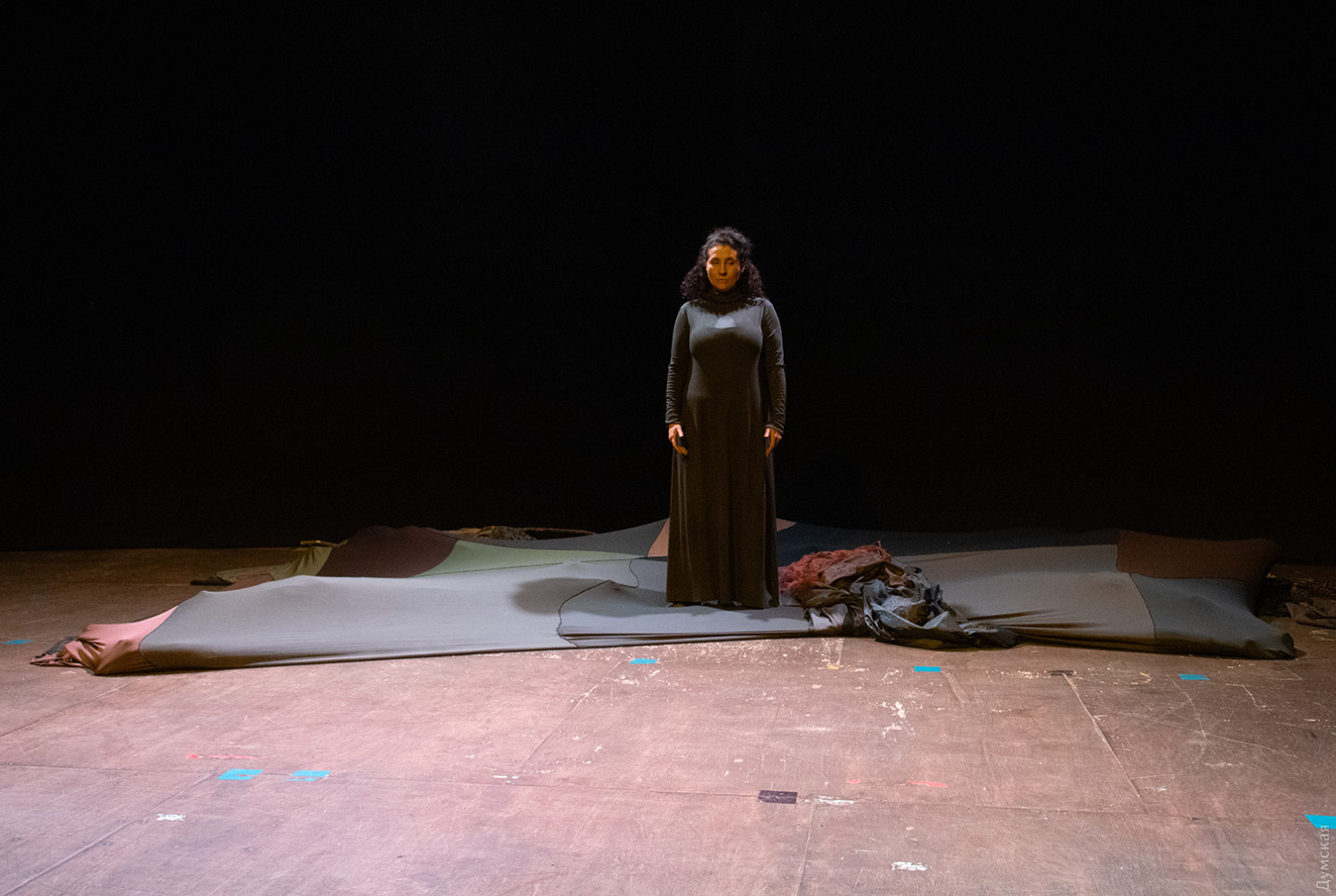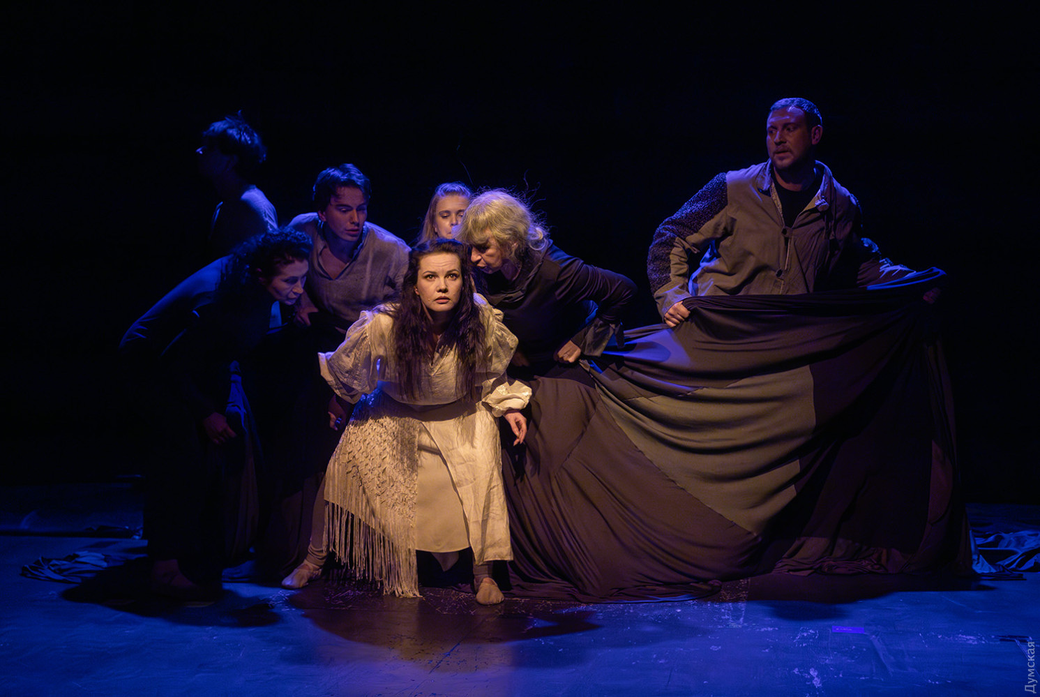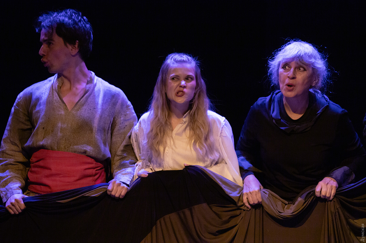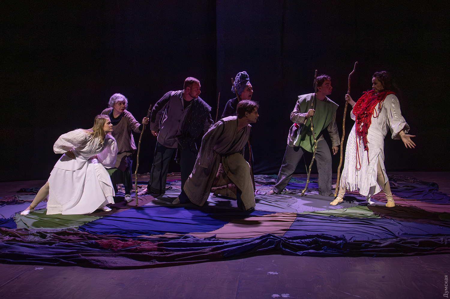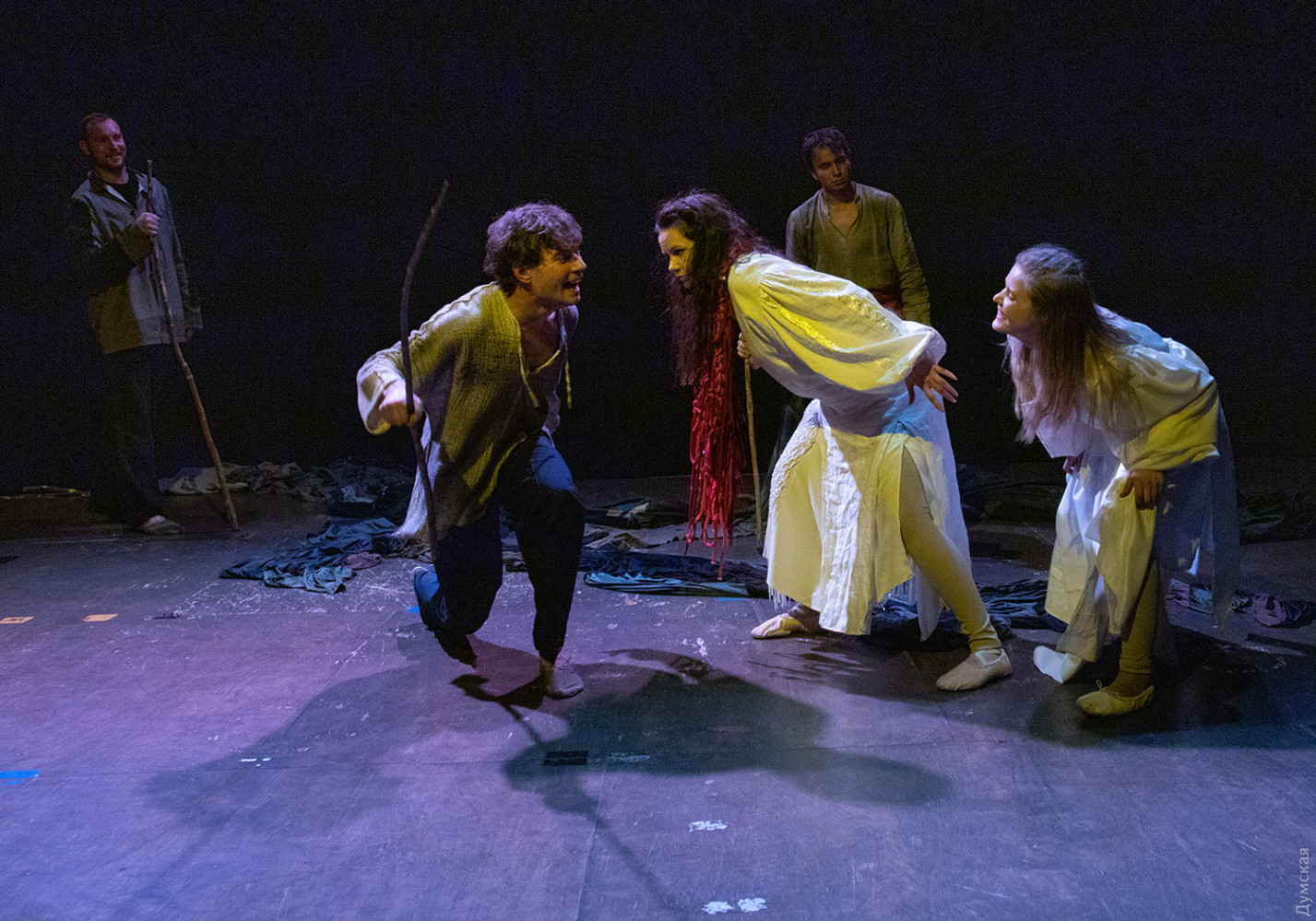 Премьера спектакля «Калинова сопілка» по мотивам повести Оксаны Забужко состоялась в Одесском академическом театре юного зрителя. Блекаут внес коррективы — начало задержали, перенастраивая сценическое освещение под работу генератора. Это первая в нашем городе театральная постановка по произведению «Казка про калинову сопілку» современной украинской писательницы и поэтессы. Повесть написана достаточно давно, но именно сейчас на украинских сценах появляется версия за версией (даже кукольный спектакль есть). Может, потому, что время задуматься о природе зла, в том числе, спрятанного в своей душе. Молодой режиссер Полина Коробейник сделала собственную сценическую версию произведения, ведь знаменитые забужковские предложения слишком длинные для провозглашения, их лучше читать глазами. Зато такие предложения можно легко разбить на реплики персонажей. Играют спектакль в формате «зритель на сцене»: так эта мистическая история приобретает особенно зловещее звучание. Поскольку перед нами разворачивается история о сестроубийстве, Каин и Авель уступают место Ганне и Оленке, мы должны заметить, что писательницу вдохновила библейская история. Ее нам сперва и покажут, это скелет сюжета, разыграют коротенько, как пошли по ягоды дедова дочка, да бабина дочка. Бабина вонзила дедовой в сердце нож и вернулась домой, мол, сестра за ней идет. А вскорости в село приходят чумаки, рассказывают, как под лесом с куста калины срезали ветку, выстрогали сопилку, а та человеческим голосом говорит, убийцу девушки обличает… Далее сказка возвращается к своему началу и наполняется деталями и смыслами, которые добавила Оксана Забужко. Так мы узнаем, что «бабина дочка» Ганнуся – любимица своей матери, а «дедова дочка» Оленка – папино любимое дитя. Смешивая приемы драмы и перформанса, актеры играют и персонажей, и голос от автора. То заворачиваясь в огромную драпировку из лоскутов ткани, то ползая по ней, будто по лугу, то даже купаясь в ней, словно в речке, постукивая посохами (они же ножи и сопилки), исполнители проверяют нашу способность принимать меру условности. Художница Елена Штепура, хореограф Мария Мартос, художница по костюмам Людмила Войновская вместе с режиссером сделали целостное произведение, не понять, где заканчиваются полномочия одного из авторов спектакля и начинаются полномочия другого. Надо сказать, что игра Златы Скальской, которая органично смотрится в ролях Золушки и других хороших сказочных девочек, впечатляет совсем по-иному. Ее Ганна-панна одновременно и невероятно одарена от природы, и глубоко несчастна, так как не оправдываются надежды на лучшую жизнь, что-то темное и жестокое растет в душе. Мать надевает на нее красный платок-ожерелье из прочных нитей, это и знак того, что Ганнуся уже не ребенок, а девушка, и намек на кровь, которая неизбежно прольется. Кто же виноват в том, что красавица Ганна сжила со свету младшую сестричку? Возможно, всему причиной первородный грех, который искупает человечество. Виновата ли мать Мария (заслуженная артистка Украины Оксана Бурлай-Питерова), пророчившая дочку незаурядную судьбу, задуривала голову сказочкой «про Ганну-панну, яка тричі приїздила на королівський бенкет — спершу четвериком, тоді шестериком, а тоді восьмериком таких вороних, як змїї, що являлися їй із розкритої верби». Что-т