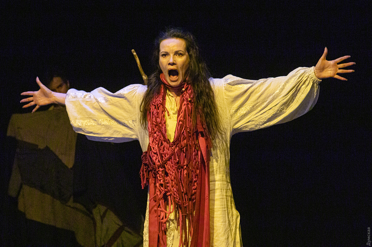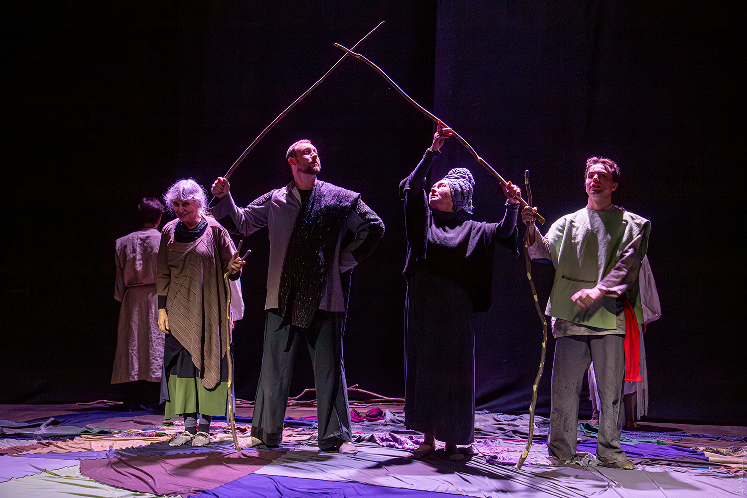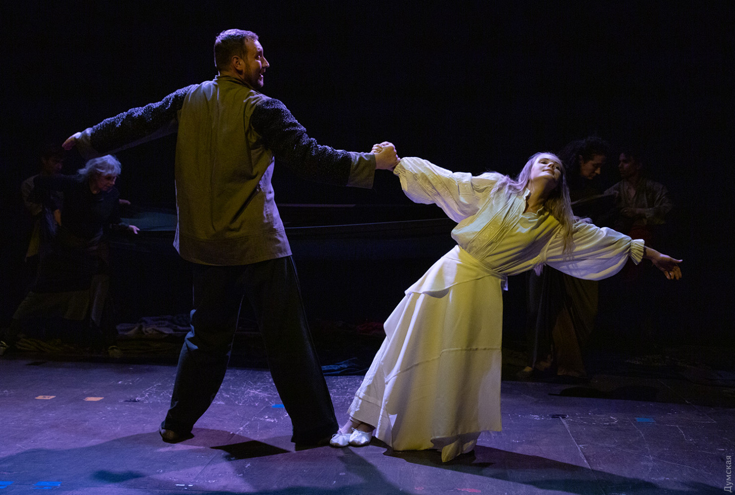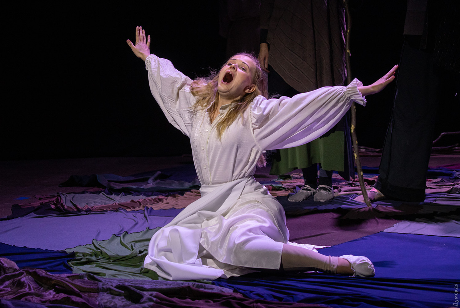 Премьера спектакля «Калинова сопілка» по мотивам повести Оксаны Забужко состоялась в Одесском академическом театре юного зрителя. Блекаут внес коррективы — начало задержали, перенастраивая сценическое освещение под работу генератора. Это первая в нашем городе театральная постановка по произведению «Казка про калинову сопілку» современной украинской писательницы и поэтессы. Повесть написана достаточно давно, но именно сейчас на украинских сценах появляется версия за версией (даже кукольный спектакль есть). Может, потому, что время задуматься о природе зла, в том числе, спрятанного в своей душе. Молодой режиссер Полина Коробейник сделала собственную сценическую версию произведения, ведь знаменитые забужковские предложения слишком длинные для провозглашения, их лучше читать глазами. Зато такие предложения можно легко разбить на реплики персонажей. Играют спектакль в формате «зритель на сцене»: так эта мистическая история приобретает особенно зловещее звучание. Поскольку перед нами разворачивается история о сестроубийстве, Каин и Авель уступают место Ганне и Оленке, мы должны заметить, что писательницу вдохновила библейская история. Ее нам сперва и покажут, это скелет сюжета, разыграют коротенько, как пошли по ягоды дедова дочка, да бабина дочка. Бабина вонзила дедовой в сердце нож и вернулась домой, мол, сестра за ней идет. А вскорости в село приходят чумаки, рассказывают, как под лесом с куста калины срезали ветку, выстрогали сопилку, а та человеческим голосом говорит, убийцу девушки обличает… Далее сказка возвращается к своему началу и наполняется деталями и смыслами, которые добавила Оксана Забужко. Так мы узнаем, что «бабина дочка» Ганнуся – любимица своей матери, а «дедова дочка» Оленка – папино любимое дитя. Смешивая приемы драмы и перформанса, актеры играют и персонажей, и голос от автора. То заворачиваясь в огромную драпировку из лоскутов ткани, то ползая по ней, будто по лугу, то даже купаясь в ней, словно в речке, постукивая посохами (они же ножи и сопилки), исполнители проверяют нашу способность принимать меру условности. Художница Елена Штепура, хореограф Мария Мартос, художница по костюмам Людмила Войновская вместе с режиссером сделали целостное произведение, не понять, где заканчиваются полномочия одного из авторов спектакля и начинаются полномочия другого. Надо сказать, что игра Златы Скальской, которая органично смотрится в ролях Золушки и других хороших сказочных девочек, впечатляет совсем по-иному. Ее Ганна-панна одновременно и невероятно одарена от природы, и глубоко несчастна, так как не оправдываются надежды на лучшую жизнь, что-то темное и жестокое растет в душе. Мать надевает на нее красный платок-ожерелье из прочных нитей, это и знак того, что Ганнуся уже не ребенок, а девушка, и намек на кровь, которая неизбежно прольется. Кто же виноват в том, что красавица Ганна сжила со свету младшую сестричку? Возможно, всему причиной первородный грех, который искупает человечество. Виновата ли мать Мария (заслуженная артистка Украины Оксана Бурлай-Питерова), пророчившая дочку незаурядную судьбу, задуривала голову сказочкой «про Ганну-панну, яка тричі приїздила на королівський бенкет — спершу четвериком, тоді шестериком, а тоді восьмериком таких вороних, як змїї, що являлися їй із розкритої верби». Что-т