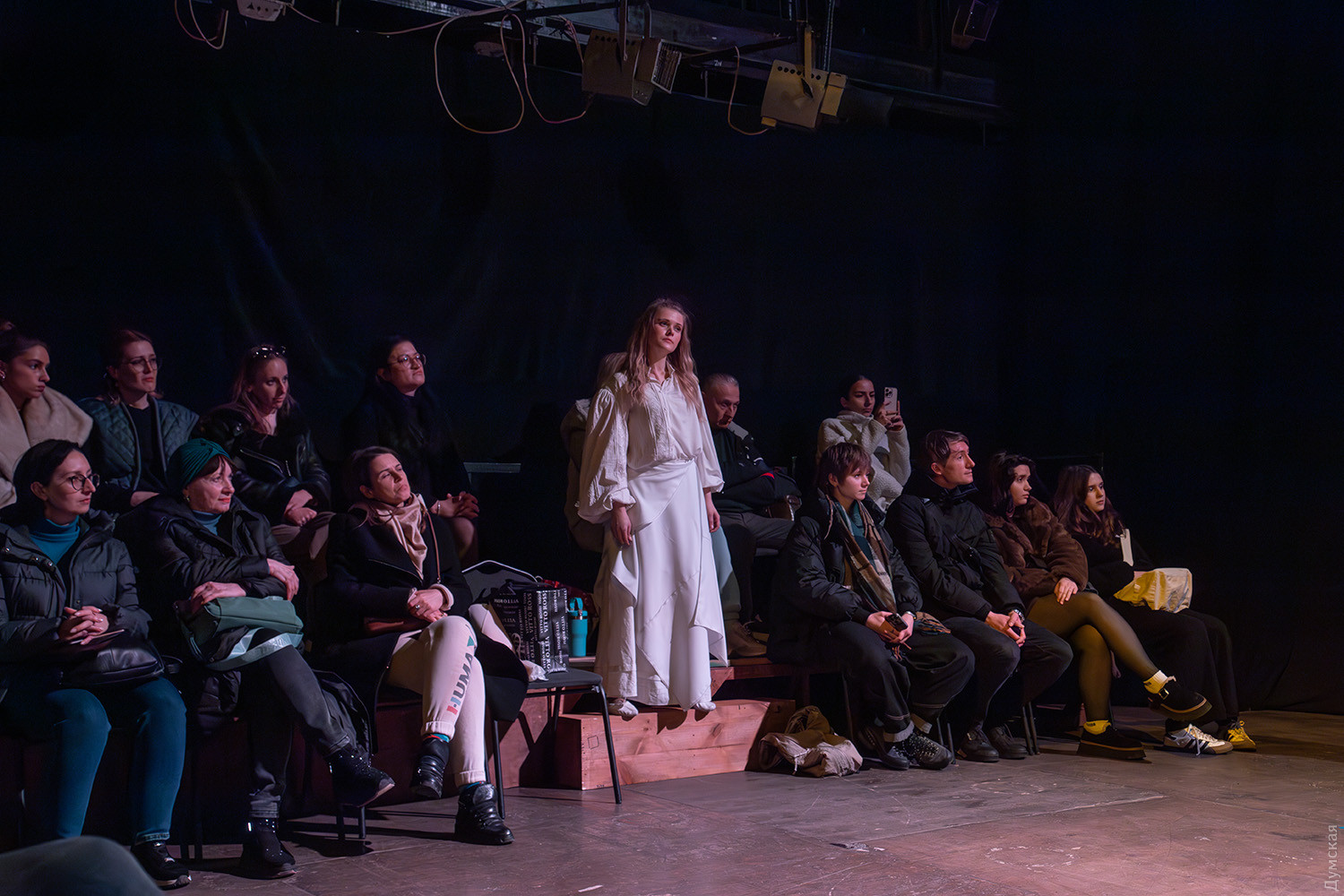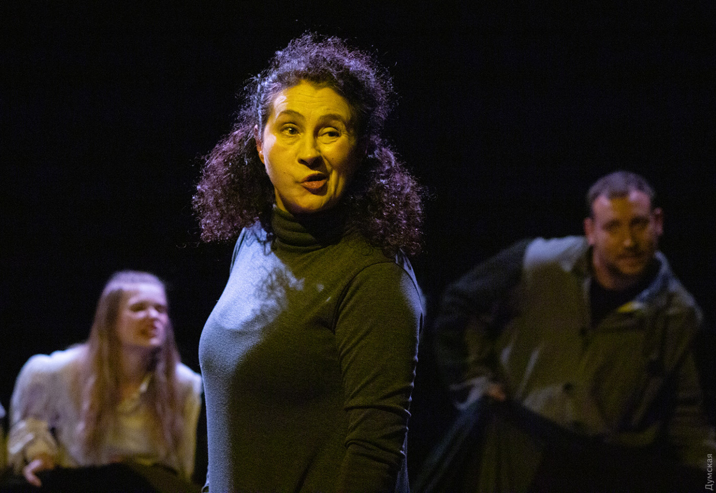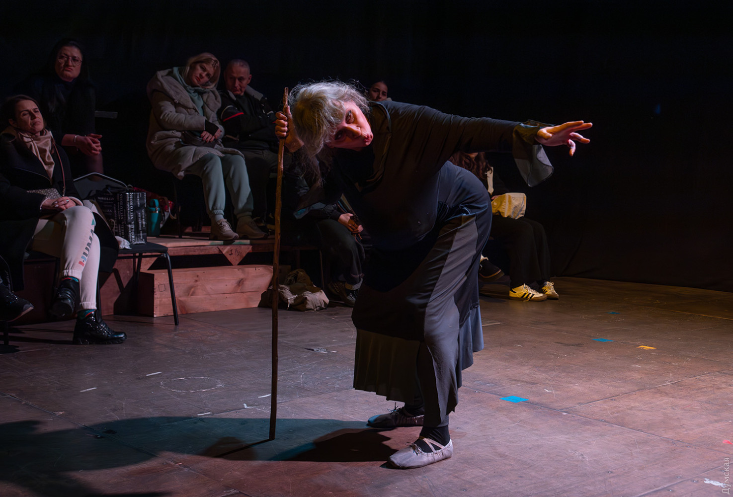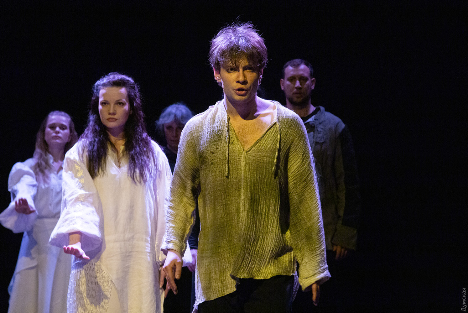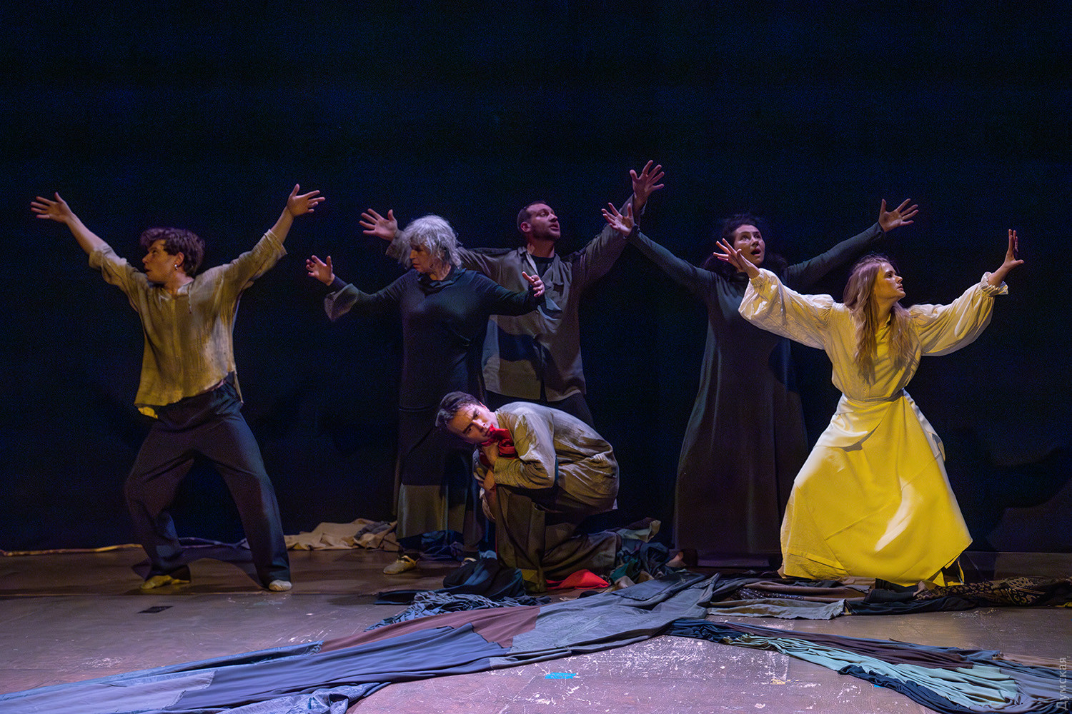 Премьера спектакля «Калинова сопілка» по мотивам повести Оксаны Забужко состоялась в Одесском академическом театре юного зрителя. Блекаут внес коррективы — начало задержали, перенастраивая сценическое освещение под работу генератора. Это первая в нашем городе театральная постановка по произведению «Казка про калинову сопілку» современной украинской писательницы и поэтессы. Повесть написана достаточно давно, но именно сейчас на украинских сценах появляется версия за версией (даже кукольный спектакль есть). Может, потому, что время задуматься о природе зла, в том числе, спрятанного в своей душе. Молодой режиссер Полина Коробейник сделала собственную сценическую версию произведения, ведь знаменитые забужковские предложения слишком длинные для провозглашения, их лучше читать глазами. Зато такие предложения можно легко разбить на реплики персонажей. Играют спектакль в формате «зритель на сцене»: так эта мистическая история приобретает особенно зловещее звучание. Поскольку перед нами разворачивается история о сестроубийстве, Каин и Авель уступают место Ганне и Оленке, мы должны заметить, что писательницу вдохновила библейская история. Ее нам сперва и покажут, это скелет сюжета, разыграют коротенько, как пошли по ягоды дедова дочка, да бабина дочка. Бабина вонзила дедовой в сердце нож и вернулась домой, мол, сестра за ней идет. А вскорости в село приходят чумаки, рассказывают, как под лесом с куста калины срезали ветку, выстрогали сопилку, а та человеческим голосом говорит, убийцу девушки обличает… Далее сказка возвращается к своему началу и наполняется деталями и смыслами, которые добавила Оксана Забужко. Так мы узнаем, что «бабина дочка» Ганнуся – любимица своей матери, а «дедова дочка» Оленка – папино любимое дитя. Смешивая приемы драмы и перформанса, актеры играют и персонажей, и голос от автора. То заворачиваясь в огромную драпировку из лоскутов ткани, то ползая по ней, будто по лугу, то даже купаясь в ней, словно в речке, постукивая посохами (они же ножи и сопилки), исполнители проверяют нашу способность принимать меру условности. Художница Елена Штепура, хореограф Мария Мартос, художница по костюмам Людмила Войновская вместе с режиссером сделали целостное произведение, не понять, где заканчиваются полномочия одного из авторов спектакля и начинаются полномочия другого. Надо сказать, что игра Златы Скальской, которая органично смотрится в ролях Золушки и других хороших сказочных девочек, впечатляет совсем по-иному. Ее Ганна-панна одновременно и невероятно одарена от природы, и глубоко несчастна, так как не оправдываются надежды на лучшую жизнь, что-то темное и жестокое растет в душе. Мать надевает на нее красный платок-ожерелье из прочных нитей, это и знак того, что Ганнуся уже не ребенок, а девушка, и намек на кровь, которая неизбежно прольется. Кто же виноват в том, что красавица Ганна сжила со свету младшую сестричку? Возможно, всему причиной первородный грех, который искупает человечество. Виновата ли мать Мария (заслуженная артистка Украины Оксана Бурлай-Питерова), пророчившая дочку незаурядную судьбу, задуривала голову сказочкой «про Ганну-панну, яка тричі приїздила на королівський бенкет — спершу четвериком, тоді шестериком, а тоді восьмериком таких вороних, як змїї, що являлися їй із розкритої верби». Что-т