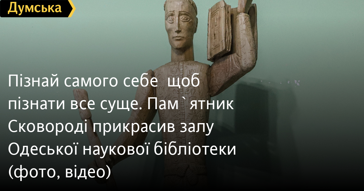 «Пізнай самого себе – щоб пізнати все суще». Пам`ятник Сковороді прикрасив залу Одеської наукової бібліотеки (фото, відео)У рік 300-річчя видатного українського філософа та письменника Григорія Сковороди одеський скульптор Олександр Князік створив йому пам’ятник. Та урочисто подарував його Одеській національній науковій бібліотеці, де, за його словами, виріс як фахівець та людина. «Пам’ятник вийшов вельми красивим, — каже директор бібліотеки Ірина Бірюкова. – Він середнього формату, вирізаний з дерева, на постаменті. Пам’ятник прикрашатиме наш «професорський» зал, де постійно знаходяться наукові працівники». Як висловилася доктор мистецтвознавства Ольга Тарасенко, Сковорода зараз дуже актуальний, його спадок – для тих, хто намагається пізнати глибинне, вічне, те, що робить людину безсмертною. А тростина мандрівника в руках фігури філософа – це, образно кажучи, сухий жезл Аарона, що раптово розквітнув, за біблійською легендою. Дерево, що стало скульптурою, набуває нового життя, навіть втративши зв’язок з корінням. Витонченість, що надихає, спрямованість вгору форм відповідає самозаглибленості особистості Сковороди, який одного разу промовив: «Пізнай самого себе – щоб пізнати все суще». Авторка — Ірен Адлер Фото — Володимира Андреєва СМЕРТЬ РОСІЙСЬКИМ ОКУПАНТАМ! Помітили помилку? Виділяйте слова з помилкою та натискайте control-enter Новини по цій темі: 2 листопада 2025: «Амінь, і поїхали»: одеситам показали портрети відьом та козака-характерника (фото) 22 вересня 2025: Артист не може бути поза політикою: Dakh Daughters в Одесі розповіли про відьом, важкі міста і в який час краще жити 19 вересня 2025: Йому довірять робити раму для Караваджо: одеситам показали виставку литовського музейника |