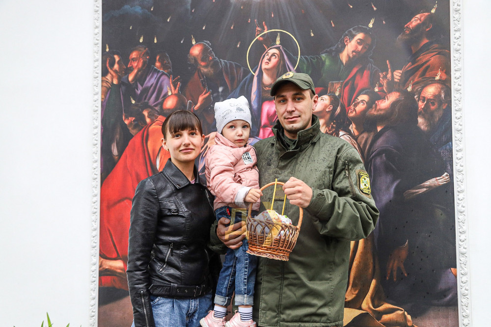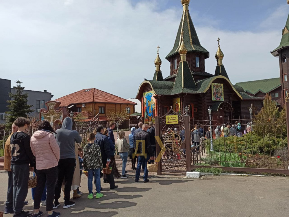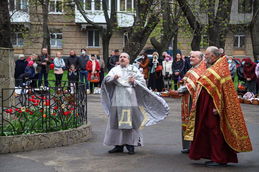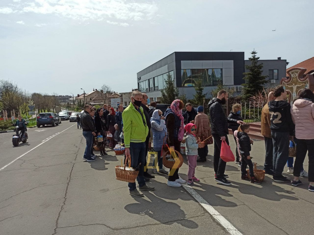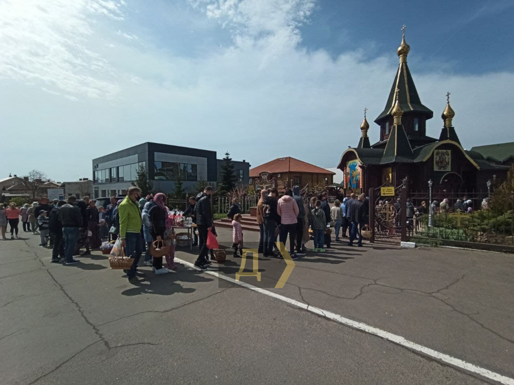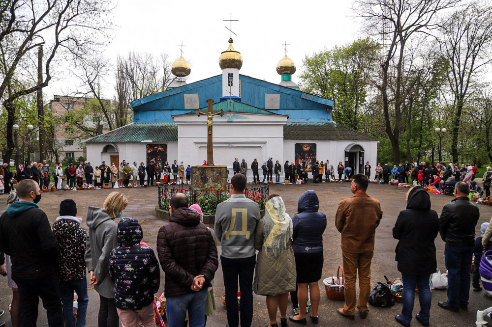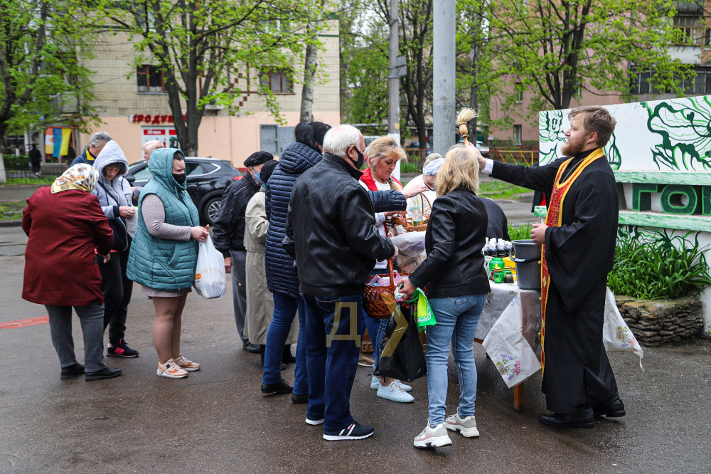 В сквере Космонавтов паски и другие пасхальные продукты освящает настоятель Свято-Троицкого храма ПЦУ отец Василий Вирозуб. Перед началом ритуала он произнес краткую речь, пожелав всем духовного и материального достатка, а также мира и победы над врагами украинского народа.
