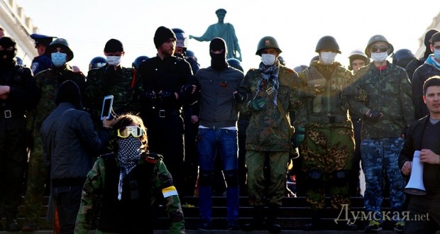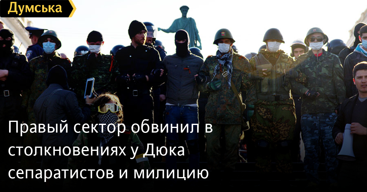 «Догнали активистов возле горсовета, где произошла небольшая стычка. Ее затеяли представители сепаратистского марша , который проходил неподалеку. Прикрыв активистов, бойцы «Правого сектора» начали отступать к Дюку во избежание кровопролития с любой стороны и заняли оборону. Сепаратисты двинулись как раз к бойцам «Правого сектора» и активистам Майдана явно с намерениями нападения», — говорится в заявлении.