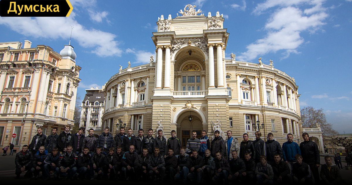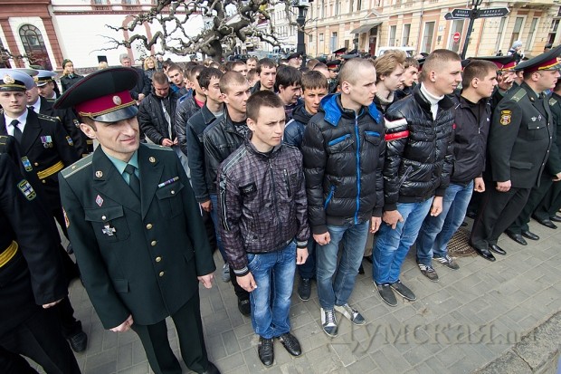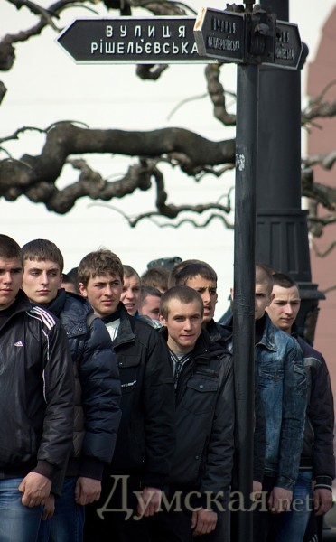 После прочувственных слов матери одного из призывников, душевного напутствия командующего и коллективной фотографии на фоне Оперного театра новые защитники Отечества отбыли к сборному пункту на Заньковецкой улице.