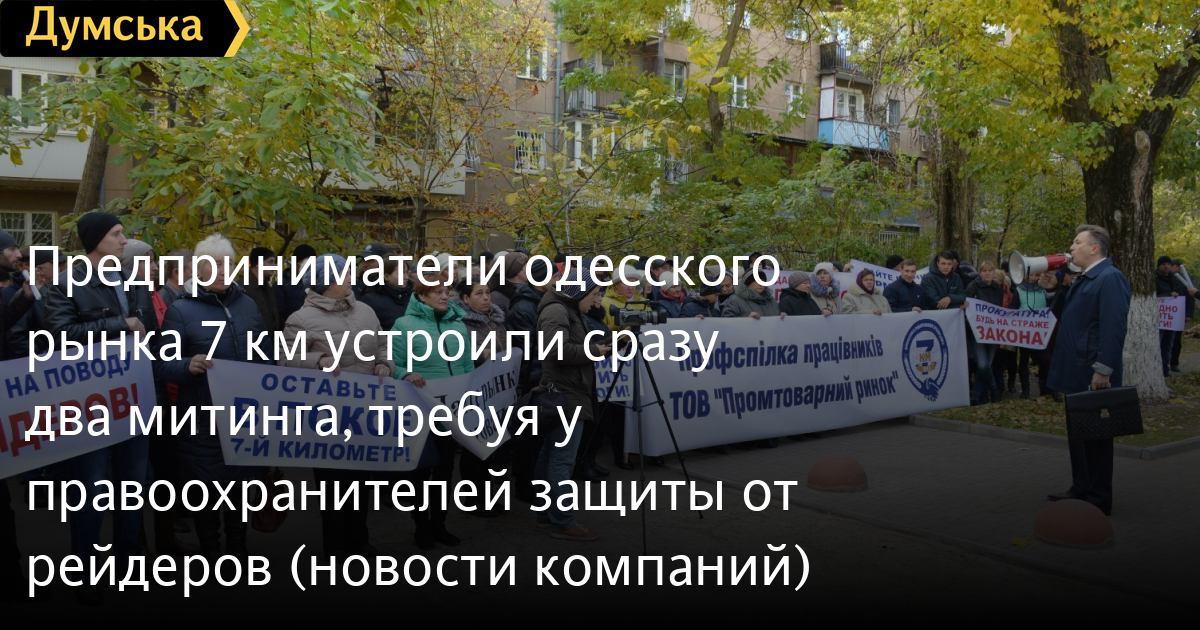 Предприниматели одесского рынка «7 км» устроили сразу два митинга, требуя у правоохранителей защиты от рейдеров (новости компаний)Члены профсоюза одесского промтоварного рынка «7 километр» устроили митинги у стен следственного управления Нацполиции и прокуратуры Одесской области. Это связано с непрекращающимися рейдерскими захватами рынка, недавним инцидентом с брошенной гранатой во двор дома заместителя директора предприятия, а также беспрецедентным давлением на руководство рынка. Протестующие требовали от правоохранителей обратить внимание на постоянное вмешательство рейдеров в их работу и обеспечить безопасность сотрудников и предпринимателей рынка. «В течение года, кроме волны рейдерских действий, промтоварный рынок стал объектом проверок со стороны правоохранительных и контролирующих органов, в частности, прокуратуры, СБУ, полиции, Госфискальной службы. При этом грубых нарушений законодательства не было выявлено. Вместе с тем, систематические проверки ставят под угрозу деятельность крупного плательщика налогов», — заявил у здания облпрокуратуры глава профсоюза предпринимателей Виктор Кудлай. Сотни людей с плакатами «Руки прочь от рынка», «Дайте рынку торговать», «Не идите на поводу у рейдеров» и другими пришли к правоохранителям не только выразить протест, но и с официальным требованием взять под личный контроль ситуацию на «7 километре» и защитить их от злоумышленников. Соответствующие заявления были переданы начальнику следственного управления ГУНП в Одесской области Сергею Пантелееву и прокурору Одесской области Олегу Жученко. СМЕРТЬ РОСІЙСЬКИМ ОКУПАНТАМ! Помітили помилку? Виділяйте слова з помилкою та натискайте control-enter |