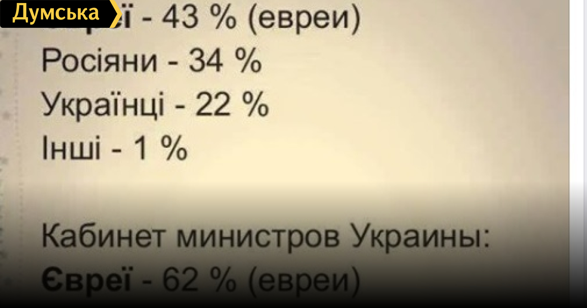 «Оппозиционер» поделился постом другого пользователя социальной сети, в которой приводятся данные какой-то антисемитской публикации о том, что управляют страной совсем не украинцы: якобы 43% депутатов Верховной Рады Украины — евреи, а в составе Кабмина — 62% представителей этой нации.