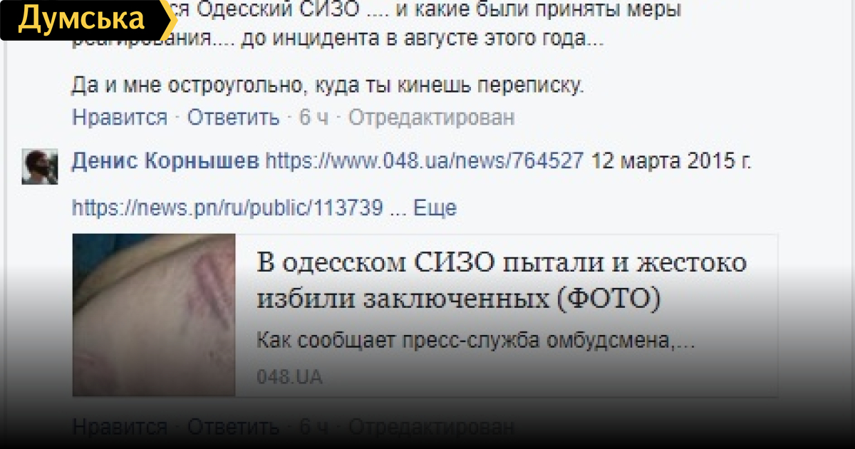 Представитель омбудсмена — одесскому журналисту: «В глаза смотреть Могут в ответ нехило копьем по попе стукнуть»Руководитель пресс-службы Уполномоченного Верховной Рады Украины по правам человека Михаил Чаплыга набросился в соцсети Фейсбук на одесского журналиста Дениса Корнышева. Чаплыгу возмутило, что Корнышев раскритиковал публичную переписку омбудсмена Валерии Лутковской и генпрокурора Юрия Луценко по поводу трагических событий в одесском СИЗО. При этом Чаплыга (официально его должность называется «представитель Уполномоченного», то есть он заместитель омбудсмена) перешел на уголовное арго и пригрозил Корнышеву, что скинет переписку с ним «товарищам в СИЗО». По всей видимости, слухи о, скажем так, далеких от проблематики правозащиты связях офиса омбудсмена с криминальным миром не лишены оснований. СМЕРТЬ РОСІЙСЬКИМ ОКУПАНТАМ! Помітили помилку? Виділяйте слова з помилкою та натискайте control-enter