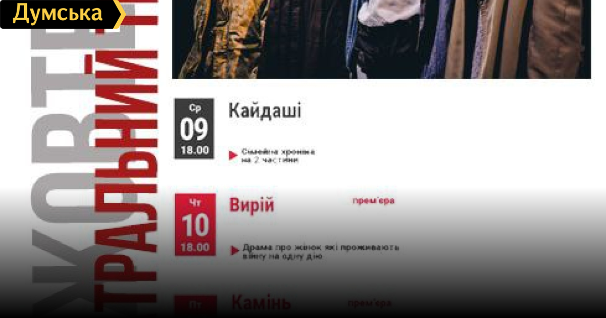 Прем`єра «Вирію», вистави про сім`ю та самотність: що подивитися в одеському Українському театрі (суспільство)Новий тиждень — нові можливості подивитися цікаві та оригінальні вистави в улюбленому Українському театрі. П'ять несхожих спектаклів чекають на найвимогливішого глядача, тож плануємо разом, а квитки можна купити тут! Сімейна хроніка на дві частини «Кайдаші» 9 жовтня 18:00 Повість «Кайдашева сім’я» була написана у 1879 році. Стільки часу минуло відтоді, а що змінилося?! Отже, жили-були Кайдаші – велика родина: Омелько Кайдаш, його дружина, сини, невістки… Поруч з ними – їхні сусіди, куми, що святкували разом з ними весілля, родини тощо. Було в їхньому житті все, як зазвичай буває у людей: свої радощі, клопоти, сварки й примирення. Турбували їх вічні проблеми, пов’язані з поколіннями, – «батьки і діти». Також вічні повсякденні проблеми життя, коли стикаються «моє» і «спільне». Комічні ситуації в цій сімейній хроніці межують з драматичними подіями. Щоправда, суперечки в родині Кайдашів такі смішні, дріб’язкові й дуже нагадують декого з нас, сьогоднішніх, у наших складних родинних взаєминах, у стосунках із сусідами, та й на ширшому рівні, так би мовити, у загальнодержавних масштабах, у нашому суспільному житті. Вистава йде з антрактом. Тривалість – 2 год. 20 хв. «Вирій» 10 жовтня 18:00 «Вирій» – драма на одну дію про жінок, які проживають війну. Кожна з них має за плечима складний життєвий шлях, і кожна рішуче вирушила у свою путь. Примхлива доля зводить їх на одній автобусній зупинці, де нечасто оголюють душу незнайомцям, але що ж робити, коли очікуваний транспорт ніяк не забере їх звідси? Нічого кращого ніж їсти цукерки й моститися просто неба на ночівлю жінки не вигадали. Та коли над ними простягається вільний інший шлях – той, що Чумацький, наприкінці якого живе Рід, то нічого приховувати одна перед одною. А перед собою?.. «Хроніка» однієї родини «Камінь» 11 жовтня о 18:00 Після падіння Берлінського муру три покоління жінок однієї родини повертаються в Дім, котрий у 30-ті роки викупив у єврейської пари голова родини, аби в них були гроші на втечу від нацистського режиму, і який його родина вже змушена була залишити, тікаючи в Західну Німеччину. Але чи зробить жінок щасливими повернення додому? Вистава висвітлює важливі теми правди та переписування історії, створення культу та підміни понять, системної помилки у родині внаслідок непропрацьованої травми. Тут мешканці постають у кількох важливих моментах історії. Діалоги одного періоду відлунюють в іншому, створюючи цілісну й моторошну у своїй правдивості історію минулого. Камінь у цій історії – німий свідок справжніх подій, з якого майстерно створили сімейну реліквію – найціннішу річ родини. Кинутий колись з ненавистю, він залишається закопаним в саду на довгі 25 років, щоб потім пролити світло на істину і вивести всіх на чисту воду. Бо Істина, як і Камінь, – незнищенна! Вистава без антракту «Тіні забутих предків» 12 жовтня 16:00 Гірський край – дивовижний, незбагненний світ. І гуцули – особливий народ, плем’я, в якому панують свої закони, які відчувають по-особливому навколишній світ… Дух предків – в них, в глибинах душі. Треба лише відчути цю споконвічну єдність… Адже ми всі – продовження наших предків. Ми спокутуємо їхні гріхи. У цьому музично-пластичному дійстві з безліччю метафоричних с