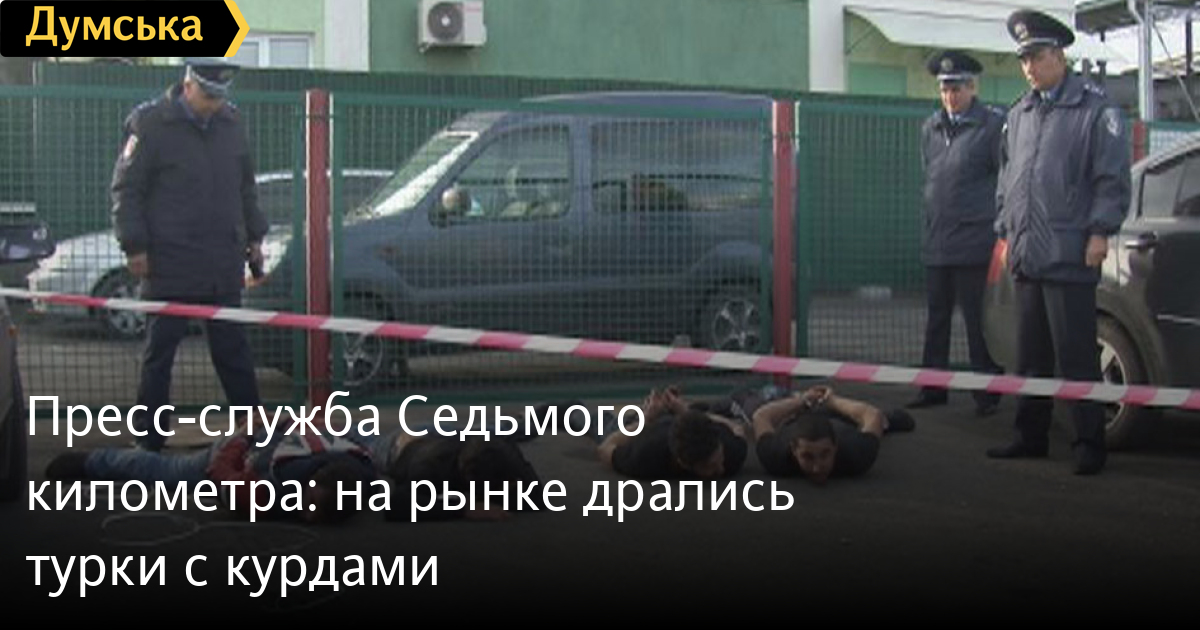 «Восемь мужчин, разругавшихся еще в Турции, решили выяснить отношения на украинской земле, для чего четверо прилетели прямо из Турции. Так как четыре участника инцидента (по предварительным данным – курды) работают наемными грузчиками у предпринимателей 7-го километра – столкновения на рынке избежать не удалось. Между старыми врагами завязалась перепалка, переросшая в драку, а затем и в кровопролитие. У дерущихся оказались ножи. К счастью, охрана рынка сработала оперативно: контролерам площадок, сотрудникам охранных фирм, работающих на промтоварном рынке, совместно с патрульно-постовой службой МВД удалось оперативно нейтрализовать 4-х нападавших, которые были доставлены сотрудниками МВД в отдел милиции.В настоящее время они находятся там под стражей в ожидании постановления суда об их аресте. Еще четверо, понимая перспективу быть арестованными, попытались скрыться с места драки на автомобиле, но были задержаны на пропускном пункте рынка. Можно констатировать, что это их и спасло, так как люди были значительно изранены. Пострадавшие участники драки были оперативно доставлены в медицинский пункт рынка, где им оказали медпомощь и отправили в ГКБ №1 и №11. Жизнь 3-их мужчин вне опасности. Один все еще находится в больнице в тяжелом состоянии», — отмечается в заявлении.