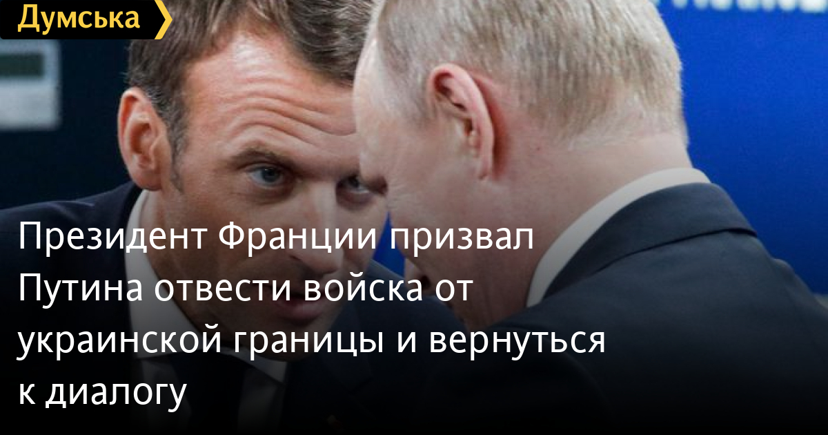 Президент Франции Эммануэль Макрон в телефонном разговоре призвал президента Российской Федерации Владимира Путина возобновить диалог с Украиной и снизить напряженность в международных отношениях.