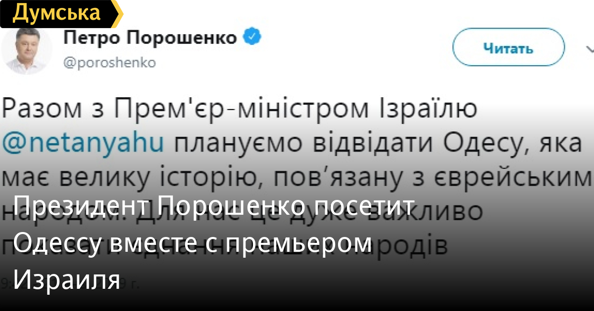 «Вместе с премьер-министром Израиля планируем посетить Одессу, у которой большая история, связанная с еврейским народом. Для нас это очень важно показать единение наших народов», – отметил Петр Порошенко.
