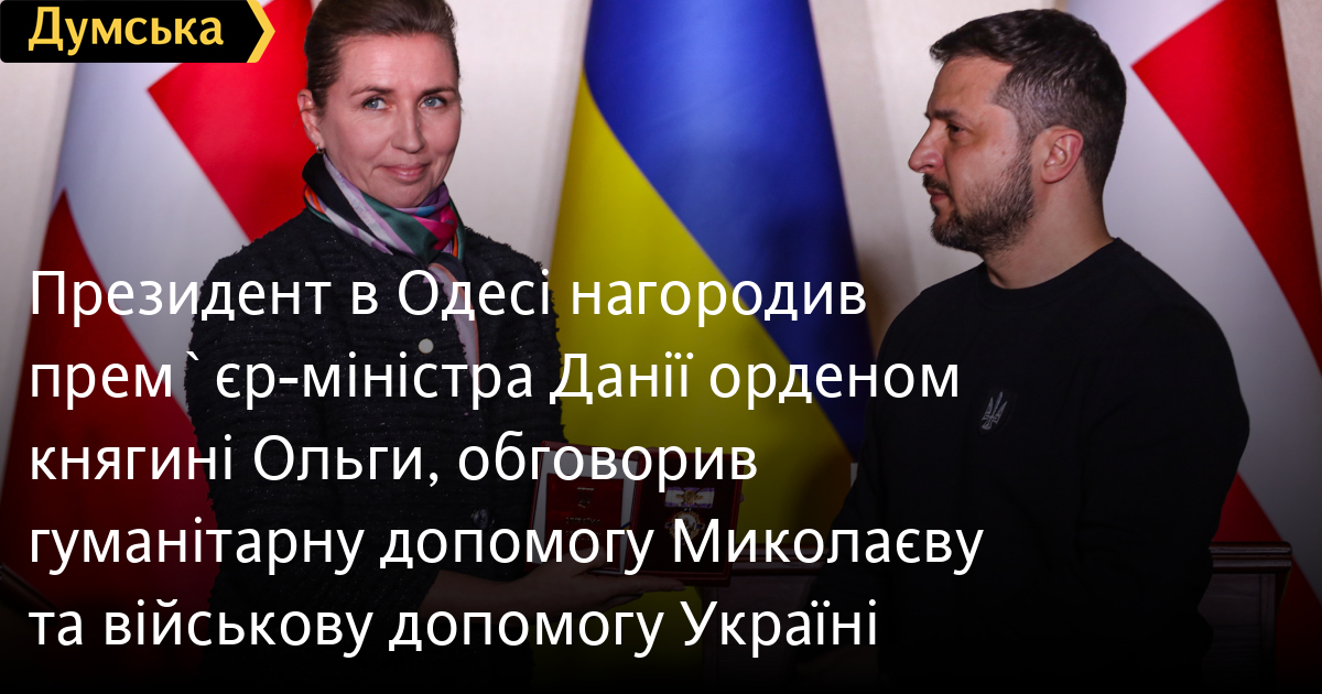 Президент в Одесі нагородив прем`єр-міністра Данії орденом княгині Ольги, обговорив гуманітарну допомогу Миколаєву та військову допомогу УкраїніОрден княгині Ольги першого ступеня за підтримку України у повномасштабній війні з росією вручив президент Володимир Зеленський прем'єр-міністрові Данії Метте Фредеріксен під час візиту до Одеси. Як передає кореспондент «Думської», делегація прибула до нашого міста для наради після відвідин Миколаєва – Данія взяла шефство над Містом Корабелів та допомагатиме у його відновленні. За словами Володимира Зеленського, окрім допомоги обласному центру на переговорах обговорювалася підтримка України у військовій сфері та на міжнародній арені, а також санкційний тиск на агресора. Крім того, сторони обговорили можливість посилення протиповітряної та протикорабельної оборони півдня України. Помітили помилку? Виділяйте слова з помилкою та натискайте control-enter