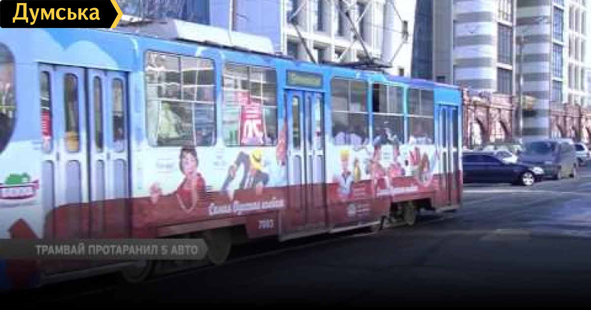 Водитель трамвая более чем в два раза превысил скорость. В результате вагон сошел с рельсов и протаранил пять авто. Жертв нет.