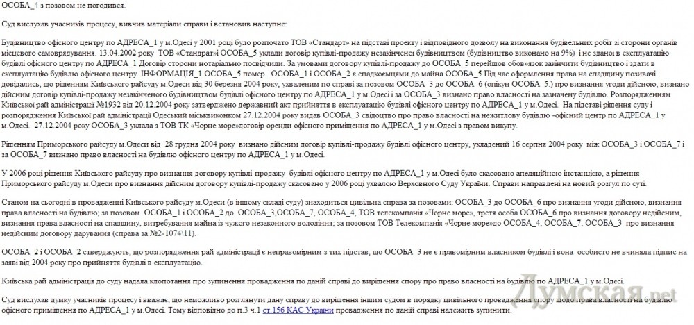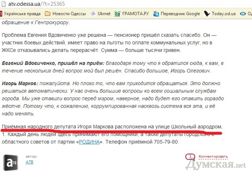 Приемная Маркова находится под арестом Генпрокуратуры: дело в суде уже два годаВот уже два года как приемная партии «Родина» и лично народного депутата Игоря Маркова, находящаяся по адресу Школьный аэродром, 1 арестована Генеральной прокуратурой. Об этом свидетельствует объявление на двери здания. «Думская» решила разузнать, в чем же обвиняют хозяев строения. Мы выяснили, что здание оказалось в центре запутанной схемы, в которую ввязались судейские и прокурорские чиновники и большой капитал. Дело тянется еще с далекого 2004 года, когда скончался бывший владелец ООО «Телекомпания «Черное море» Сергей Дегтярь. Не будем вдаваться в подробности обстоятельств кончины коммерсанта, а обратим внимание на момент более прозаичный — дележ наследства. Незадолго до смерти Дегтярь приобрел недостроенное здание офисного центра у аэродрома. После его кончины наследники (первая и вторая жены) взялись переоформлять имущество, дабы сдать его «Черному морю». Интересы супруг Дегтяря в суде представляла некая Ольга Ильченко, которая впоследствии сыграет одну из ключевых ролей во всей этой истории. Партнеры Дегтяря, которым тот при жизни задолжал крупную сумму, по решению суда отобрали здание. Наследницы коммерсанта остались с пустыми руками, что их, естественно, совсем не устроило. В результате длительных переговоров на неизвестных нам условиях жены уговорили новых владельцев перепродать помещение по более высокой цене, а разницу вернуть им. Но ушлая адвокатесса, недолго думая, подделала документы и при помощи подельников через суд оформила имущество на себя. В деле были задействованы несколько влиятельных соучастников, без которых афера госпожи Ильченко не удалась бы. Согласно выводам прокуратуры, ей помогали бывший зампред главы Приморского районного суда Одессы Наталья Гандзий, ее муж Игорь Гандзий, начальник следственного управления областной прокуратуры, секретарь суда Зазашвили и некий Прокаев, работавший в одесском УБОПе и уволенный за взятку. Они обвиняются в мошенничестве, совершенном в особо крупных размерах организованной группой; подлоге документов, отмывании доходов и злоупотреблении властью. Сейчас на объект имеют виды сразу несколько человек: жена №1 и жена №2 (которые, в принципе, готовы разделить имущество пополам); кредиторы, забравшие офис за долги; Ольга Ильченко, незаконно оформившая право собственности и «Телекомпания «Черное море», для которой изначально строилось здание. Кстати, по нашей информации, полтора года Ильченко провела в СИЗО, но потом ее выпустили под подписку о невыезде. Как сообщил в интервью «Думской» экс-владелец компании «Черное море», депутат горсовета Александр Череп, Генпрокуратура обязала компанию следить за сохранностью здания. «С 2006-го года и до сих пор «Черное море» оплачивает охрану, делает ремонт крыши, когда она начинает течь. Здание стоит пустое», — сказал Череп. При этом во время последних выборов в здании находилась приемная кандидата Маркова. «Может, договорились с хозяйкой, хотя мы писали ему, он отвечал, что никакой приемной там не было и нет», — отмечает бывший собственник телекомпании. Как бы то ни было, не так давно Верховный суд Украины отменил все права собственности на это здание, а суд первой инстанции, куда дело вернули на дорасследование, принял решение о передаче им