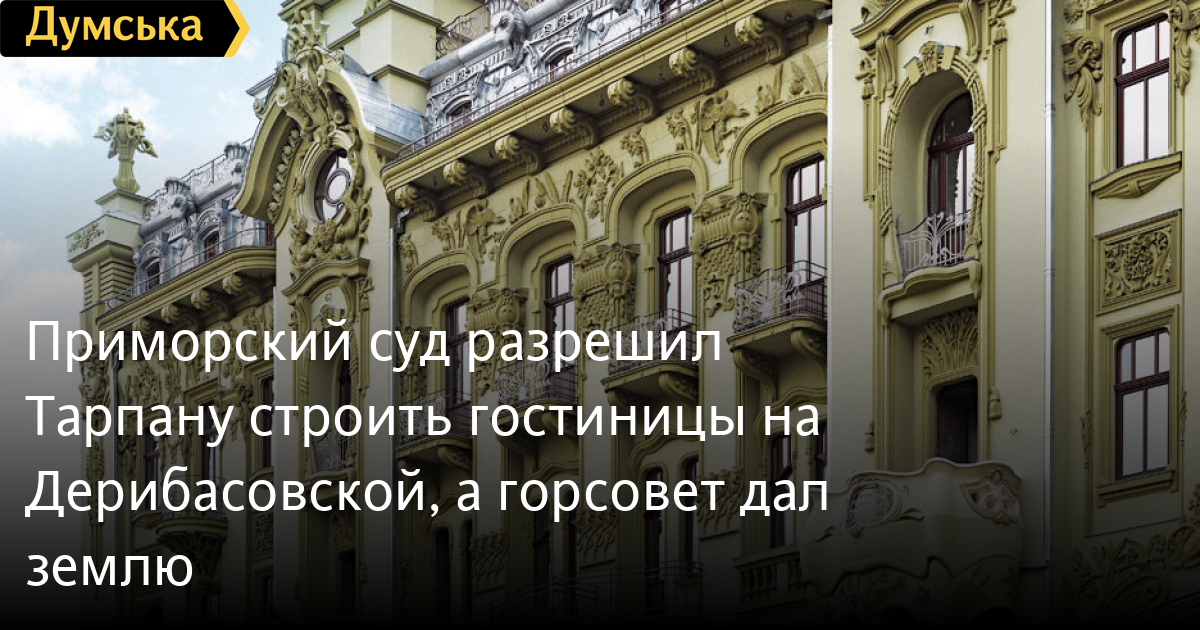 Приморский суд разрешил Тарпану строить гостиницы на Дерибасовской, а горсовет дал землюПриморский районный суд Одессы удовлетворил административный иск ООО «Мрия» к Одесскому горсовету и отменил как незаконное решение муниципального собрания от 8 апреля 2011-го года, которым у компании отобрали право реконструировать гостиницу «Большая Московская» и строить отель «Империал» на Дерибасовской улице. Горсовет тогда, напомним, отменил решение исполкома 2007-го года, которым ООО дали возможность вести работы. Это стало следствием личного конфликта между мэром Одессы Алексеем Костусевым и владельцем «Мрии» Русланом Тарпаном. Между тем, как отмечает в своем вердикте судья Лариса Ершова, органы местного самоуправления не могут отменять собственные решения, если они касаются прав и охраняемых законом интересов юридических и физических лиц. Мэрия должна была обратиться в судебные органы, но не сделала это. Интересно, что представители муниципалитета не явились ни на одно заседание по иску «Мрии». Ну а сегодня сессия горсовета предоставила в аренду фирме земельный участок площадью 0,28 га на углу Дерибасовской и Красного переулка, где должно начаться строительство «Империала». Гостиница «Спартак» была построена в 1875 году. Первоначально называлась «Империалом». Летом 2008 года здание, являющееся памятником архитектуры, демонтировали якобы из-за крайне ветхого состояния. Тарпан задумал возвести на его другой отель — со старым названием «Империал» и в стиле модерн. Площадь гостиницы составит 35 тыс квадратных метров. В отеле будут 205 номеров, рестораны, залы для банкетов и конференций, подземный паркинг и бутики. Авторы проекта — Сергей Андрианов, Александр Чернов, Владимир Глазырин, Кира Юдина. Соседнюю гостиницу — «Большую Московскую» — возвели в 1904 году. Памятник архитектуры национального значения. К концу XX века сильно обветшала и была заброшена. В 2007-м году началась реконструкция здания в пятизвездочный отель (проект отца и сына Повставнюков). В настоящее время работы приостановлены, хотя фасад «Московской» почти готов. СМЕРТЬ РОССИЙСКИМ ОККУПАНТАМ! Заметили ошибку? Выделяйте слова с ошибкой и нажимайте control-enter