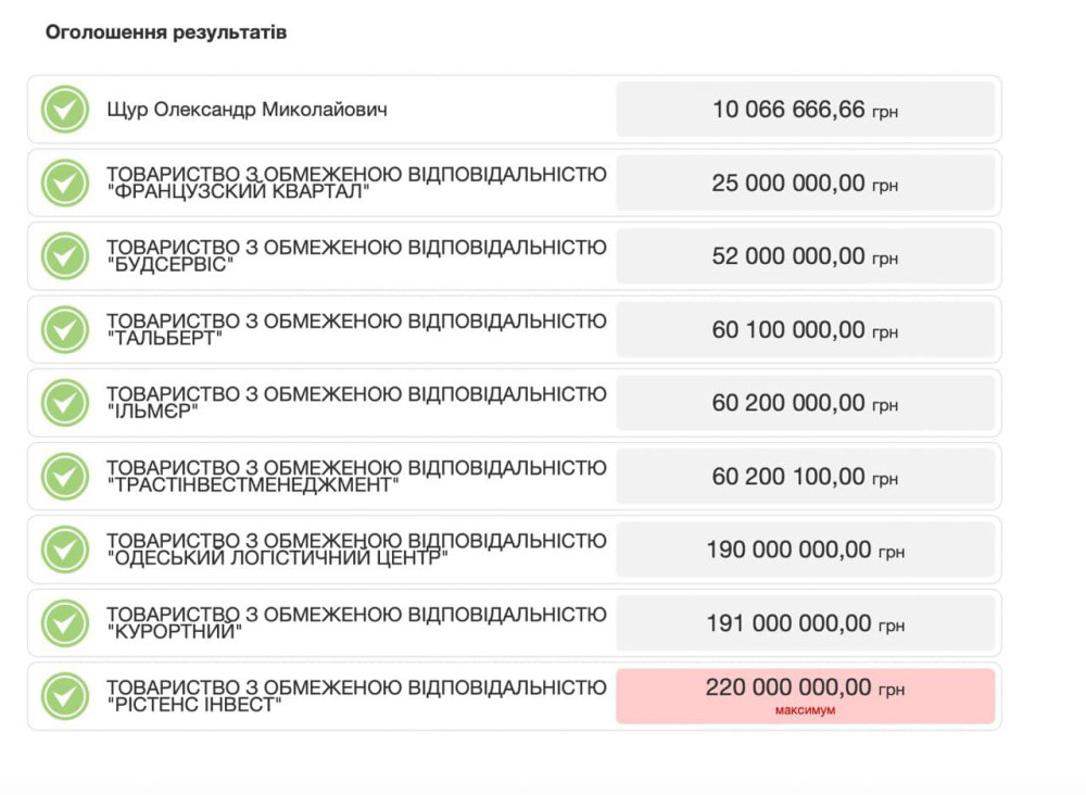 За його словами, в аукціоні взяли участь дев'ять компаній. За час торгів ціна лота збільшилася в 30 разів — з 7,4 до 220 млн грн.