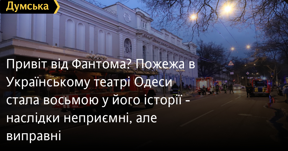 Привіт від Фантома? Пожежа в Українському театрі Одеси стала восьмою у його історії — наслідки неприємні, але виправніОдеський академічний український музично-драматичний театр імені Василя Василька наздоганяє за кількістю пожеж Одеську оперу — вчорашня була восьмою за його історію, що розпочалася майже 120 років тому. Про саму подію «Думська» повідомляла напередодні, а тепер доповнюємо інформацію відомостями, отриманими з редакційних джерел. Поки що офіційного висновку про причину загоряння не отримано, але, найімовірніше, вибухнув один з акумуляторів в освітлювальному цеху, де деяке обладнання закуповували ще в 1980-х. У будь-якому разі, театр збирався міняти світловий пульт, але через велику війну ці плани довелося відкласти. Можливо, і на краще, а то новий загинув би в полум'ї, адже світлоцех повністю вигорів. Уникнути найгіршого розвитку подій допомогла нещодавно встановлена протипожежна сигналізація. До слова, ця сигналізація настільки чутлива, що спрацьовує навіть від вихлопу театральної дим-машини (ще одна причина відмовитися, нарешті, від використання агрегату, що змушує кашляти всі перші ряди). СМЕРТЬ РОСІЙСЬКИМ ОКУПАНТАМ! Помітили помилку? Виділяйте слова з помилкою та натискайте control-enter Новини по цій темі: 8 листопада 2025: Безкоштовні виставки, майстер-клас і модний мерч: Одеському художньому – 126 років (фото) 2 листопада 2025: «Амінь, і поїхали»: одеситам показали портрети відьом та козака-характерника (фото) 22 вересня 2025: Артист не може бути поза політикою: Dakh Daughters в Одесі розповіли про відьом, важкі міста і в який час краще жити |