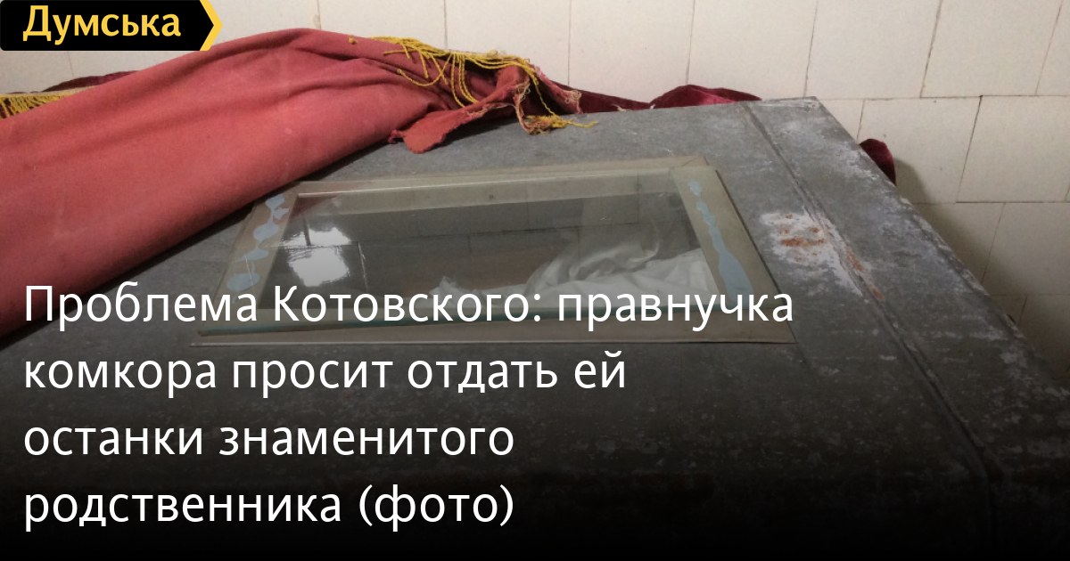Тело большевистского военачальника Григория Котовского по-прежнему остается в мавзолее в городе Подольске, до декоммунизации носившем его имя, несмотря на решение местного совета о перезахоронении. «Думская» неоднократно писала об этой проблеме. Муниципалитет утверждает, что без разрешения родственников не может предать комкора земле. Между тем закон «О погребении и похоронном деле» в данном случае никакими особыми правами потомков покойного не наделяет.