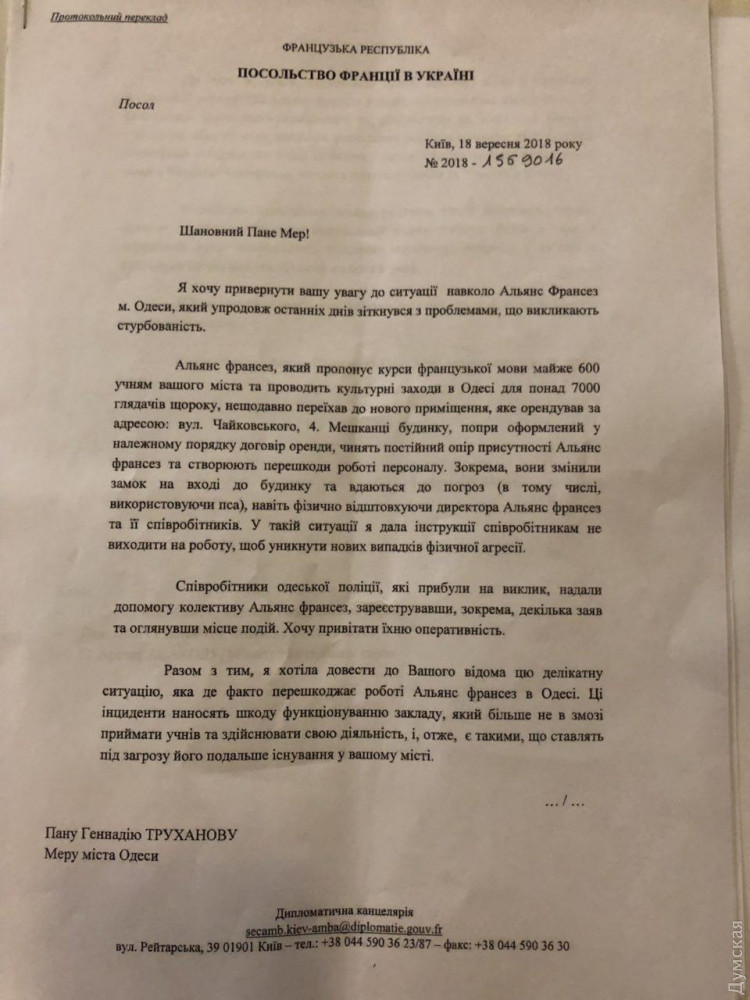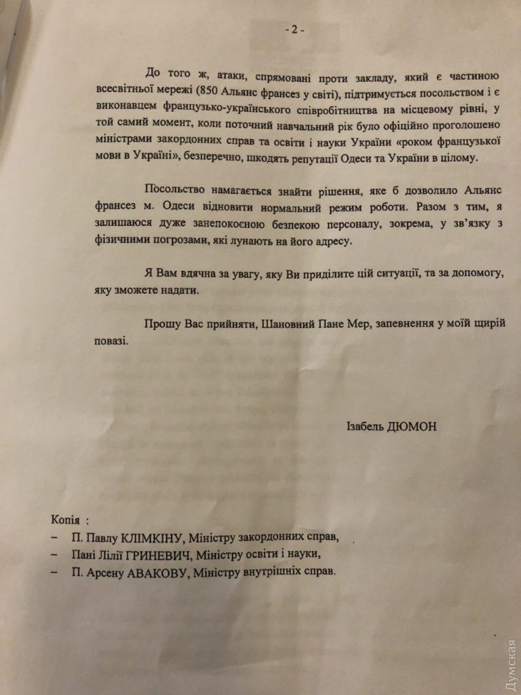 «Этот год на уровне министров иностранных государств обеих стран был назван годом французского языка в Украине, и на фоне этого происходят эти атаки», — говорится в письме Дюмон на имя городского головы.