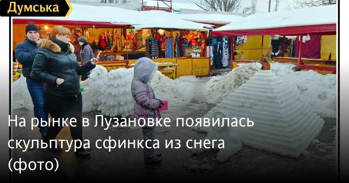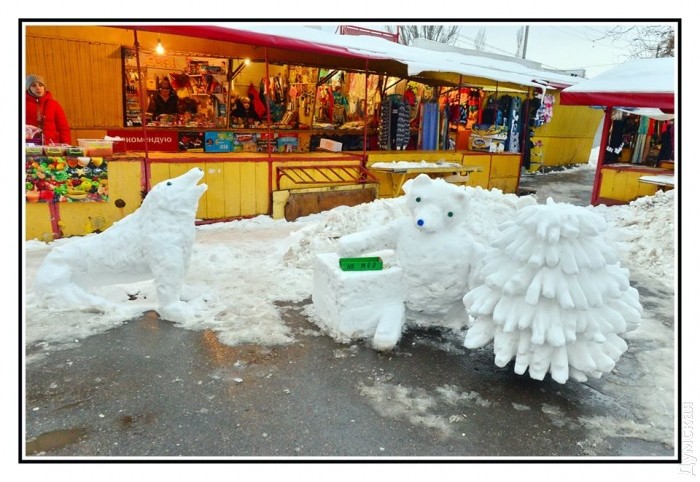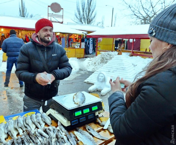 На небольшом рынке в Лузановке торговец сушеной рыбой украшает торговые ряды впечатляющими снежными скульптурами.