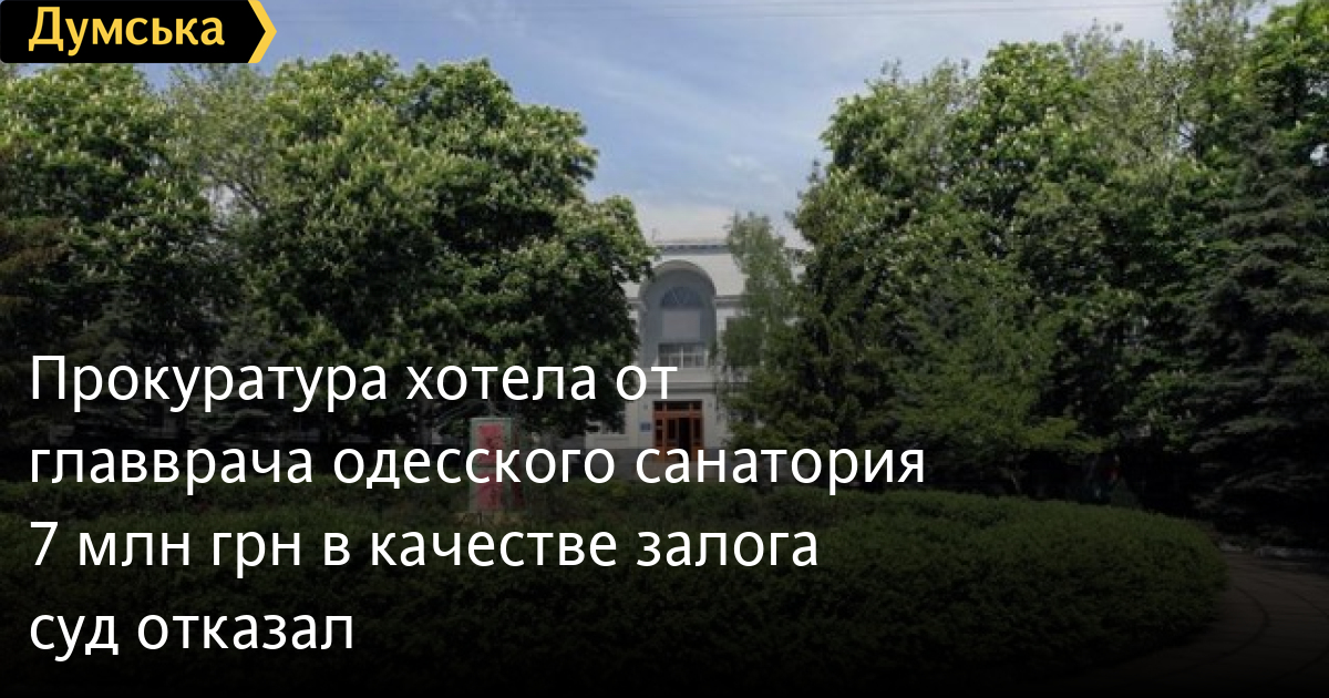 Приморский районный суд Одессы отказал прокуратуре города, просившей избрать меру пресечения в виде колоссального залога – 7,2 млн грн – для бывшего главврача специализированного детского санатория «Люстдорф», которую обвиняют в разбазаривании земель здравницы.