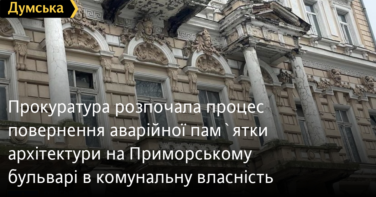 Прокуратура подала позов до Госпсуду Одеської області про повернення в комунальну власність занедбаної пам'ятки архітектури — Прибуткового будинку Лерхе на Приморському бульварі, 5.