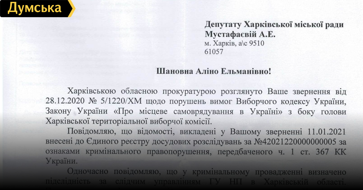 Прокуратура открыла уголовное производство в отношении главы Харьковской ТИК, которая признала Кернеса мэромПрокуратура Харьковской области открыла уголовное производство в отношении главы Харьковской городской территориальной избирательной комиссии Ольги Морозовой, которая 9 декабря признала мэром города Геннадия Кернеса, хотя в это время он находился на лечении за границей и не принес присягу городского головы. О начале расследования заявила депутат Харьковского горсовета Алина Мустафаева, которая ранее написала в прокуратуру запрос об открытии производства. Действия главы горТИК квалифицировали по ч.1 ст.367 УК Украины (служебная халатность). Напомним, Кернес скончался от осложнений COVID-19 в берлинской клинике «Шарите» 17 декабря. СМЕРТЬ РОСІЙСЬКИМ ОКУПАНТАМ! Помітили помилку? Виділяйте слова з помилкою та натискайте control-enter |