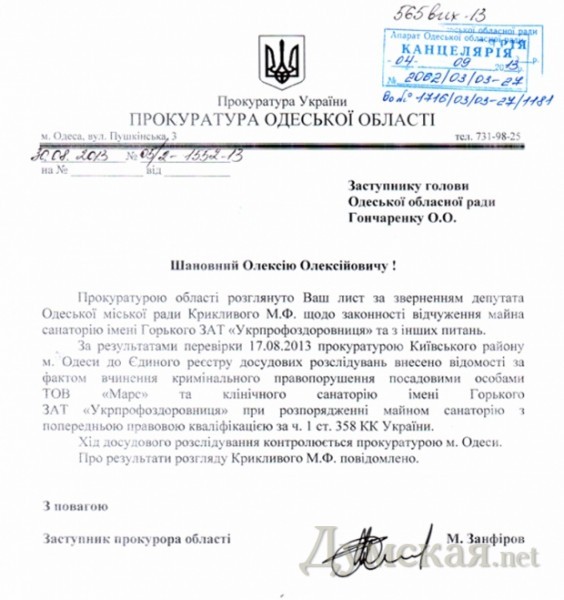 Прокуратура Одесской области отреагировала на обращение заместителя председателя облсовета Алексея Гончаренко и депутата горсовета Николая Крикливого по поводу ситуации вокруг здравницы, лишившейся в начале 2000-х трех с половиной гектаров земли. Там, если помните, вырос коттеджный городок. Правоохранители выявили факт подлога документов авторами дерибана санатория — руководителем ООО «Марс» Олегом Олеговичем Марковым и дирекцией одесского филиала «Укрпрофздравницы». Открыто уголовное производство, ведется расследование.