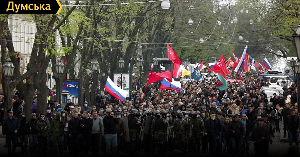 Не найдя в порту американский эсминец, пророссийские активисты (их примерно 2 тысячи) постояли немного у Дюка и направились к зданию СБУ на Еврейской улице.