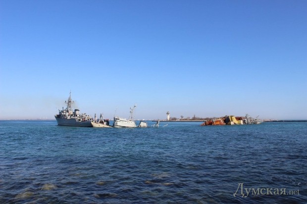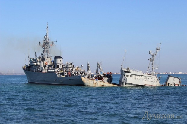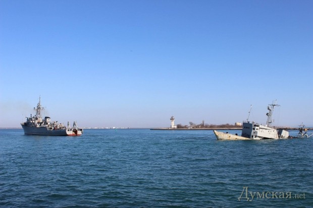 Ведомые мужественным экипажем «Черкассы» вплотную приблизились к одному из судов, которые россияне затопили в боновых воротах, и набросили на него тросы. На этот маневр отреагировал ракетный катер (по нашей классификации — корвет) Р-60. На нем объявили боевую тревогу и продемонстрировали готовность открыть огонь.