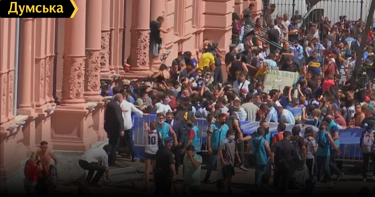 Прощание с Марадоной: в Буэнос-Айресе произошли массовые беспорядки и столкновения с полициейЦеремония прощания с легендарным футболистом Диего Марадоной, которая проходила сегодня во дворце президента Аргентины в Буэнос-Айресе, переросла в массовые беспорядки и столкновения с полицией. Как сообщают СМИ, когда траурная процессия приблизилась к президентскому дворцу, футбольные фанаты пытались протиснуться поближе к гробу Марадоны, а полиция попыталась сдержать поток людей. В силовиков полетели бутылки, толпа пыталась снести металлические ограждения. Чтобы усмирить самых буйных фанов, полицейским пришлось применить слезоточивый газ и резинострелы. Еще одна скандальная ситуация возникла с похоронами Марадоны — сотрудник похоронного бюро Буэнос-Айреса Диего Молина выложил в социальные сети селфи, на котором он позирует рядом с телом умершего футболиста. На фото изображен Молина, который положил правую руку на лоб Марадоне, а левой рукой показывает большой палец. Фотография вызвала возмущение среди членов семьи Мародоны, а также простых аргентинцев, которые требуют наказания для Молины за публикацию этого снимка. Владелец похоронного бюро уже заявил, что сотрудник, сделавший и опубликовавший эту фотографию, уже уволен. СМЕРТЬ РОСІЙСЬКИМ ОКУПАНТАМ! Помітили помилку? Виділяйте слова з помилкою та натискайте control-enter Новини по цій темі: 21 червня 2024: Євро-24: збірна України здобула першу перемогу на турнірі, здолавши збірну Словаччини 17 червня 2024: Єврошок: збірна України з футболу стартувала з нищівної поразки на Чемпіонаті Європи |