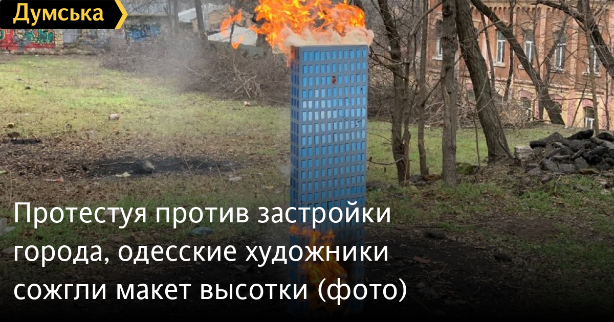 Одесские художники Кирилл Бондаренко и Ярослав Войцеховский провели перформанс против незаконной застройки города и в знак протеста сожгли макет высотки на склонах бульвара Жванецкого. Как сообщает «Суспільне. Одеса», художники назвали акцию рефлексией на сложившуюся ситуацию с хаотической застройкой города. Кирилл Бондаренко создавал макет около 40 часов. Получился дом из фанеры в форме надгробия, а двери в парадную – в виде гроба. «Это одесский контекст, символично, что поджарить небоскреб в центре города нам было негде. И здесь все застраивается. У нас есть проблема, она очень высотная и пожароопасная. Выше 16 этажей пожарные не могут добраться до огня и ликвидировать его», — пояснил художник. СМЕРТЬ РОСІЙСЬКИМ ОКУПАНТАМ! Помітили помилку? Виділяйте слова з помилкою та натискайте control-enter Новини по цій темі: 26 червня 2025: Сумнівний подарунок: пам'ятку архітектури на Приморському бульварі намагаються повернути одеській громаді 17 серпня 2025: Продають мерч у залі Костанді, ховають Стародавній Єгипет у підвалах і виставляються в Німеччині: як виживають одеські музеї (частина перша) 27 лютого 2025: Компанія з групи Коломойського готується до будівництва торгового центру біля Дерибасівської 20 грудня 2024: Спроба провалилася: суд відмовився визнавати готель-барак на схилі 13-ї Фонтану в Одесі нахаббудом |