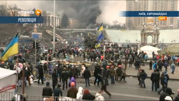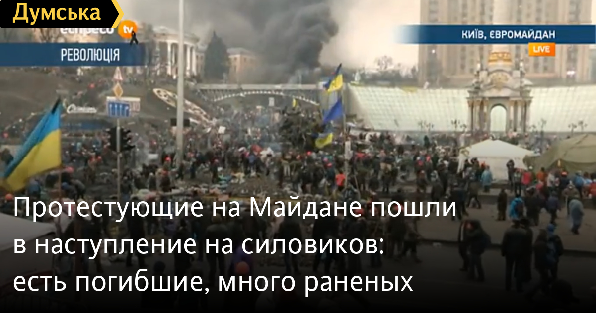 По непроверенной информации, началось наступление активистов с применением огнестрельного оружия. По крайне мере, об этом кричали бойцы «Беркута» при отступлении. Ранее протестующие со сцены объявили, что изъяли оружие у силовиков, – охотничье ружье. При отступлении силовики отстреливались. Наши коллеги сообщают о двух погибших.