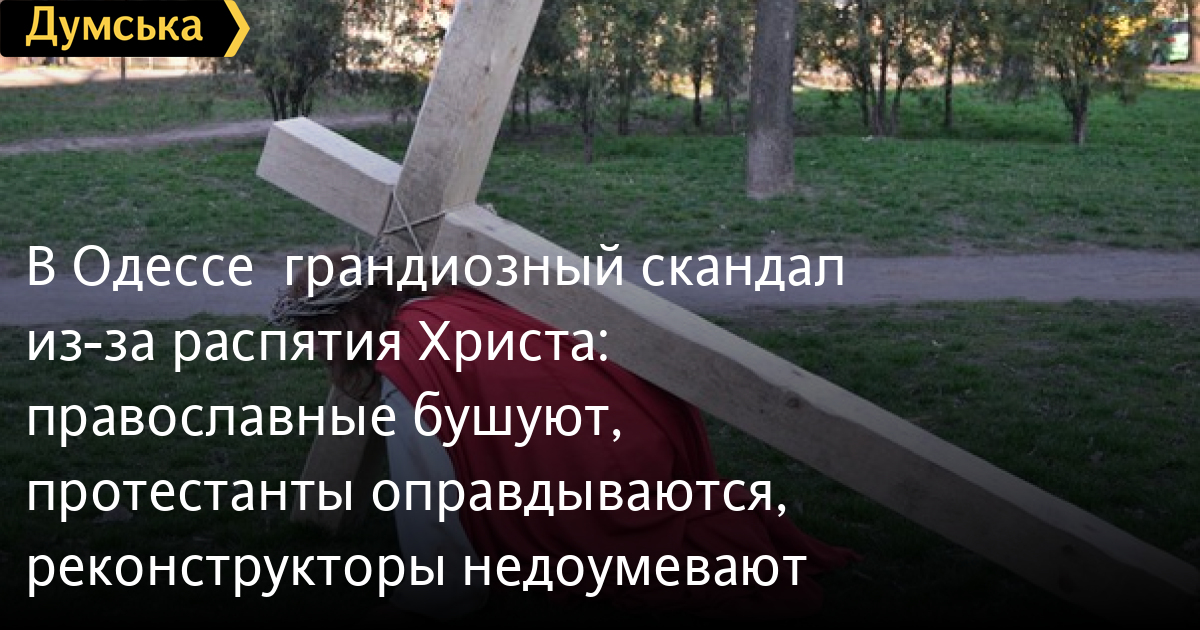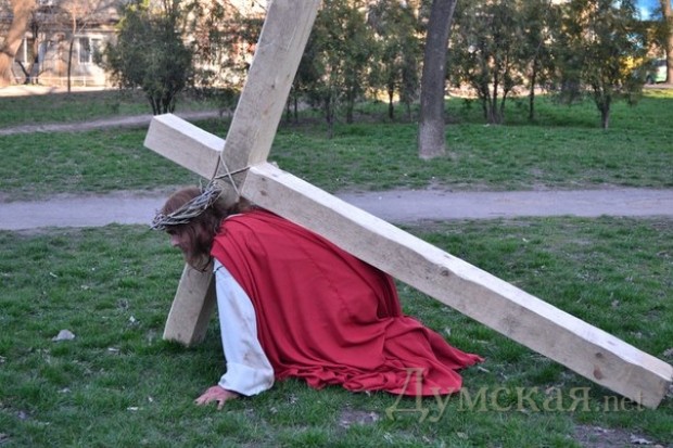 Готовящаяся театральная постановка, посвященная библейской истории о распятии Иисуса Христа, вызвала очередной религиозный скандал в Одессе. Как мы уже писали, православная епархия выступила с резким осуждением этой реконструкции и даже попросила городскую власть запретить ее как «кощунственную», поскольку «распять Христа» планируется в Страстную пятницу – священный для всех христиан день. А вчера около полусотни верующих с православной и монархической атрибутикой в руках прошлись по центральным улицам города крестным ходом, выразив таким образом свою поддержку позиции митрополита Агафангела. Они передали в мэрию свою подписи за запрет постановки.