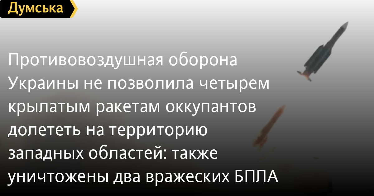Противовоздушная оборона Украины повредила одну и уничтожила три крылатые ракеты, выпущенные из двух вражеских истребителей Су-35 с территории беларуси по территории Украины.